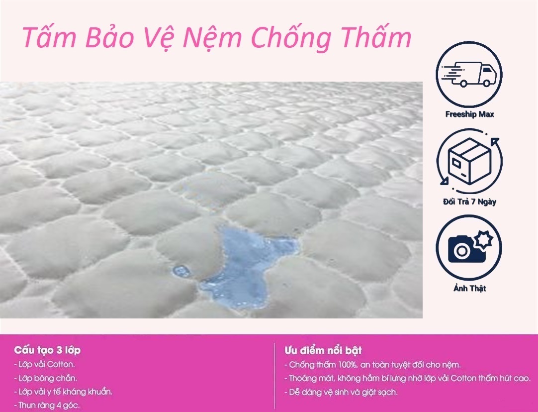 Tấm lót bảo vệ nệm chống thấm 100% giúp bạn giải quyết triệt để vấn đề nước đổ lên nệm, hay bé tè dầm, nôn ói làm nệm bị dơ và có mùi khó chịu.