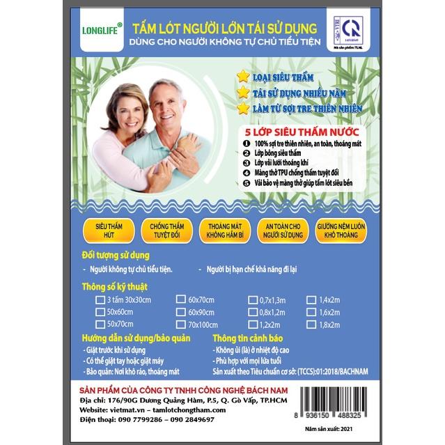 - Longlife là Tấm lót chống thấm tái sử dụng cho người già nhiều người dùng nhất Việt Nam. II. Cấu trúc của Tấm lót chống thấm cho người già/miếng lót chống thấm cho người già LONGLIFE: 5 lớp độc đáo: Lớp thứ 2: lớp bông dày, giúp hút nước tiểu và mồ hôi. Lớp này ngoài chức năng hút nước còn giúp tấm lót nằm rất êm, phù hợp với đối tượng sử dụng là người già, người bệnh. Lớp thứ 3: lớp vải lưới, giúp không khí lưu thông, người lớn nằm không bị hầm bí lưng, dù nằm lâu ngày. Lớp thứ 5: lớp vải giúp tấm lót hạn chế bị xê dịch. Trong trường hợp cần, vẫn có thể dùng nằm trực tiếp. Đặc biệt lớp này bảo vệ lớp chống thấm nên tấm lót giặt máy vẫn bền lâu, an toàn. III. Kích thước: Tấm lót chống thấm cho người già/miếng lót chống thấm cho người lớn LONGLIFE có nhiều kích thước phù hợp với nhiều mục đích sử dụng khác nhau: Lót mông, từ lưng trở xuống: size 40x60cm, 50x70cm, 60x70cm, 60x90cm, 62x114cm, 70x100cm, 70x130cm, 80x120cm. Lót cả giường: size 90x190cm, 120x200cm, 140x200cm, 160x200cm, 180x200cm, 200x220cm. IV. Điểm đặc biệt của tấm lót chống thấm cho người lớn LONGLIFE ✓ Mặt hàng tấm lót chống thấm cho người già duy nhất trên thị trường có cấu tạo 5 lớp được sản xuất tại Việt Nam và có thể tái sử dụng nhiều năm. ✓ Thấm hút nước cực tốt: nhờ cấu tạo đến 5 lớp, có thể thay thế cho tã giấy. ✓ Siêu mềm, êm: do tấm lót dày, có lớp bông hút nước. ✓ Kháng khuẩn cao: nhờ làm từ vải 100% sợi tre, không phải từ nilong hay cao su. ✓ Chống thấm 100%: tuyệt đối không thấm xuống giường, nệm dù có bao nhiêu nước. ✓ Thoáng khí và dễ chịu, không gây dị ứng và hăm da nhờ chất liệu 100% sợi tre. ✓ Sử dụng tiện lợi bất cứ nơi đâu: giường, nệm, sàn nhà, ngoài trời,…. ✓ Giặt tay hay giặt máy đều tốt, và sử dụng nhiều lần (Độ bền tới 5 năm). ✓ Đường may chắc chắn (bước 1 vắt sổ, bước 2 may viền 1 kim). ✓ Sản phẩm đáp ứng tiêu chuẩn cơ sở theo TCCS số 01:2018/BACHNAM. V. Nơi sản xuất: – Sản xuất tại Việt Nam bởi Công ty TNHH Công nghệ Bách Nam. Công ty Bách Nam cũng là đơn vị sản xuất các loại tấm lót chống thấm chất lượng nổi tiếng như VIETMAT, TILO, SUPERMAT. VI. Kiểm định chất lượng – Sản phẩm được kiểm định khả năng chống thấm, an toàn đối với người sử dụng tại Viện nghiên cứu dệt may tại (VTRSI)