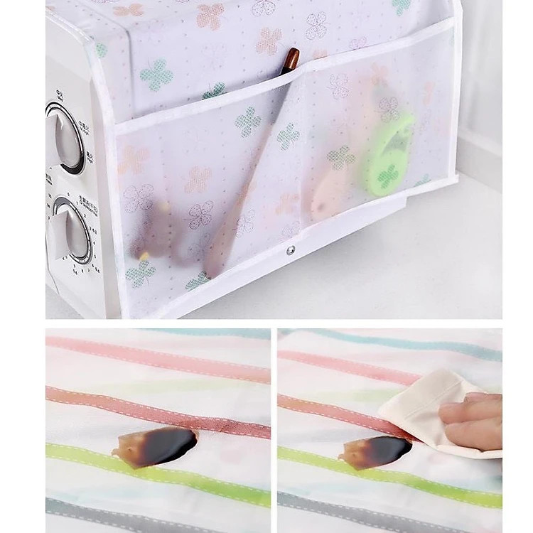 Áo trùm lò vi sóng. Áo phủ lò vi sóng bao trùm được toàn bộ lò vi sóng, phía bên hông còn có ngăn để đựng các dụng cụ nhà bếp gọn gàng, giúp bạn