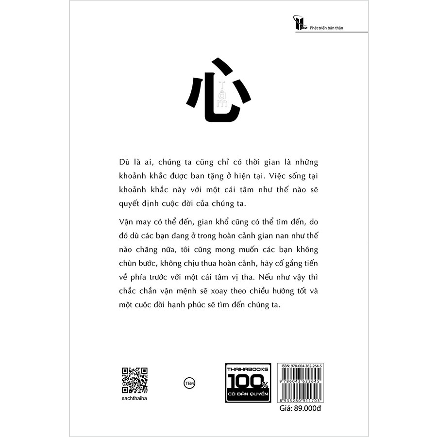 Dù là ai, chúng ta cũng chỉ có thời gian là những khoảnh khắc được ban tặng ở hiện tại. Việc sống tại khoảnh khắc này với một cái tâm như thế nào sẽ quyết định cuộc đời của chúng ta. Vận may có thể đến, gian khổ cũng có thể tìm đến, do đó dù các bạn đang ở trong hoàn cảnh gian nan như thế nào chăng nữa, tôi cũng mong muốn các bạn không chùn bước, không chịu thua hoàn cảnh, hãy cố gắng tiến về phía trước với một cái tâm vị tha. Nếu như vậy thì chắc chắn vận mệnh sẽ xoay theo chiều hướng tốt và một cuộc đời hạnh phúc sẽ tìm đến chúng ta. Nếu có thể nghĩ như vậy thì cuộc đời vô cùng đơn giản. Trong cuộc sống hàng ngày, nếu chúng ta cứ nỗ lực hết mình với một cái tâm vị tha thì chắc chắn vận mệnh sẽ xoay theo chiều hướng tốt và một cuộc đời hạnh phúc sẽ tìm đến.