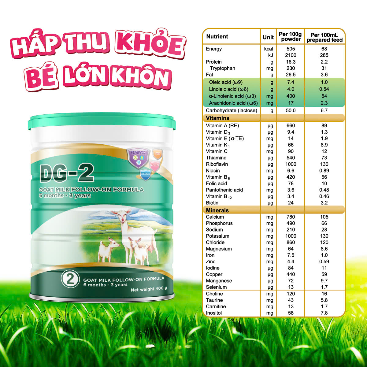 SỮA DÊ CÔNG THỨC DG-2 GOAT MILK FOLLOW-ON FORMULA Dành cho trẻ em từ 6 tháng đến 3 năm tuổi Khối lượng tịnh: 800g/hộp Thời hạn sử dụng: 03 năm kể từ ngày sản xuất Chú ý: Sữa mẹ là thức ăn tốt nhất cho sức khỏe và sự phát triển toàn diện của trẻ nhỏ.   Với cơ chế tiết sữa bán hủy bào độc đáo (Apocrine), Sữa Dê DG là giải pháp dinh dưỡng khoa học cho trẻ. • DỄ TIÊU HOÁ, HẤP THU Đạm sữa dê DG mềm, mịn và nhẹ nhàng với dạ dày của trẻ, dễ tiêu hoá hơn đạm sữa bò. Sữa dê DG chứa các axit béo chuỗi trung bình dễ tiêu hoá và hấp thu • HỖ TRỢ PHÁT TRIỂN TRÍ NÃO Sữa Dê DG chứa các chất dinh dưỡng như Taurine, Choline, Sắt, Selen AA và Axit Alpha Linolenic, giúp hỗ trợ phát triển trí não. Sữa dê DG được sản xuất từ nguồn sữa dê nguyên chất với MFGM tự nhiên có chứa các hoạt chất sinh học, hỗ trợ phát triển sự nhận thức của trẻ. • HỖ TRỢ PHÁT TRIỂN THỂ CHẤT Sữa dê chứa một lượng lớn các Nucleotide, hỗ trợ tăng cường miễn dịch cho trẻ, đồng thời hỗ trợ tối ưu sự phát triển thể chất. • HẠN CHẾ TÌNH TRẠNG DỊ ỨNG Trẻ em có khả năng dị ứng với sữa dê thấp hơn sữa bò 5 lần. 25% trẻ em dị ứng với sữa bò không dị ứng với sữa dê. Hàm lượng Casein Alpha S1 trong sữa dê chỉ bằng 1/5 so với sữa bò, giúp gỉam thiểu khả năng gây dị ứng đạm sữa.   HƯỚNG DẪN SỬ DỤNG VÀ BẢO QUẢN 1. Hướng dẫn sử dụng: Trong mỗi hộp đều có sẵn một thìa đong với khối lượng 4,5g. Hãy thực hiện đúng các hướng dẫn sử dụng.   Bước 1: Rửa cốc hoặc dụng cụ để pha và các đồ dùng khác bằng nước nóng hoặc một chất tiệt trùng đã được phê duyệt. Tráng thật sạch. Bước 2: Đun sôi nước và để cho nguội bớt Bước 3: Đổ đúng một lượng nước vào dụng cụ để pha. Bước 4: Dùng thìa trong hộp để đo đúng lượng bột tùy vào độ tuổi của bé. Xúc đầy thìa sau đó dùng dao sạch để gạt bằng miệng thìa. Bước 5: Với mỗi thìa bột cần phải pha với 30ml nước. Bước 6: Dùng thìa khuấy hoặc lắc dụng cụ pha để hòa tan. Khuyến cáo và cảnh báo an toàn: Không dùng lại phần còn dư   LƯỢNG SỬ DỤNG CHO 1 LẦN PHA Trẻ 6 – 9 tháng tuổi: 8 thìa pha 240 ml nước ấm, dùng 3-4 lần/ ngày. Trẻ 9 – 12 tháng tuổi: 7 thìa pha 210 ml nước ấm, dùng 3-4 lần/ ngày.