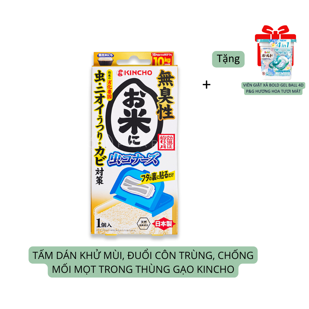 Quà tặng: VIÊN GIẶT XẢ BOLD GEL BALL 4D P&G HƯƠNG HOA TƯƠI MÁT trị giá 99K     THÀNH PHẦN: Tinh dầu Bạch đàn chanh, chiết xuất Trà xanh, than củi. CÔNG DỤNG Công dụng: Sản phẩm giúp xua đuổi côn trùng có hại (mối, mọt,...) xâm nhập vào thùng gạo, giúp hấp phụ và khử mùi hôi khó chịu trong thùng gạo, đồng thời kiểm soát độ ẩm trong thùng gạo, từ đó ngăn ngừa sự hình thành của nấm mốc, vi khuẩn, giúp duy trì độ thơm ngon của gạo trong suốt quá trình bảo quản. Hiệu quả của sản phẩm kéo dài trong khoảng 6 tháng. CÁCH DÙNG Hướng dẫn sử dụng: Mở bao bì nhôm và lấy sản phẩm ra. Bóc miếng giấy ở mặt sau của tấm dán, bộc lộ ra bề mặt dính. Dán chặt sản phẩm vào mặt sau của nắp thùng gạo hoặc bên trong hộp đựng thức ăn. Bạn cũng có thể đặt trực tiếp sản phẩm lên gạo. Sử dụng 1 tấm dán cho mỗi thùng gạo 15 kg. BẢO QUẢN: Nơi khô ráo, thoáng mát. Tránh tiếp xúc ánh sáng trực tiếp hoặc nhiệt độ cao. Để xa tầm tay trẻ em. LƯU Ý: Không sử dụng sản phẩm cho mục đích khác. Không tháo rời các bộ phận của sản phẩm. Nếu sản phẩm bị vỡ/rách và bạn vô tình chạm tay vào bộ phận bên trong, hãy rửa tay kỹ với xà phòng và nước.   NHÀ SẢN XUẤT DAINIHON JOCHUGIKU Co.,Ltd. 1-4-11, Tosabori, Nishi-ku, Osaka 550-0001, Japan.