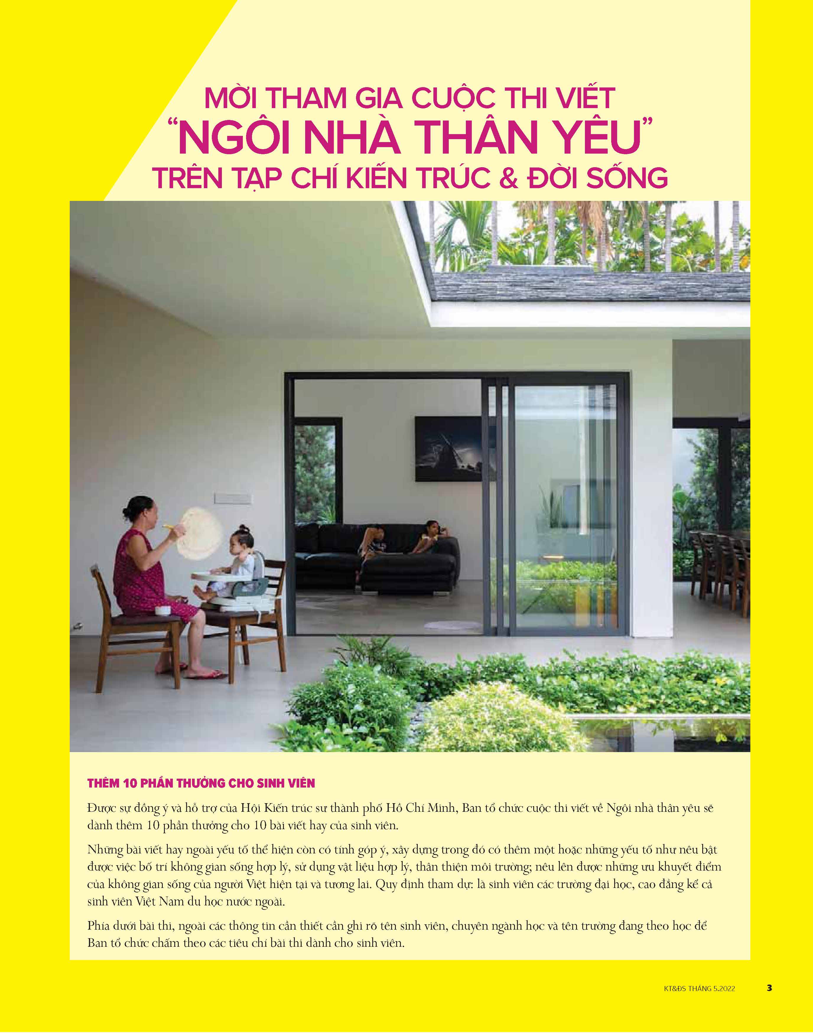 Trong số báo tháng 5.2022, có một nội dung quan trọng mà chúng tôi muốn thông báo đến quý dộc giả là Ban tổ chức cuộc thi viết về Ngôi nhà thân yêu bổ sung thêm 10 phần thưởng dành cho các bài viết hay của các bạn sinh viên tham dự cuộc thi. Chi tiết xin xem ở các trang 3-4 của số báo này. Rất mong được ủng hộ