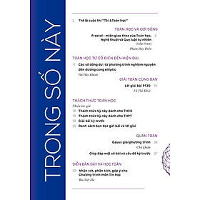 + Toán học và cuộc sống: Diễn giải các khái niệm, các định lý của Toán học thông qua các hiện tượng thiên nhiên và xã hội mà chúng ta quan sát hoặc cảm nhận được. Giới thiệu những thành công của toán học ứng dụng vào đời sống. Giúp bạn cảm nhận vẻ đẹp của toán thông qua sự tưởng tượng trong không gian, việc trải nghiệm với thời gian, tính tổng quát và sự tối giản trong phát biểu các khái niệm và các định lý, sự chặt chẽ và tính bất ngờ trong các chứng minh…