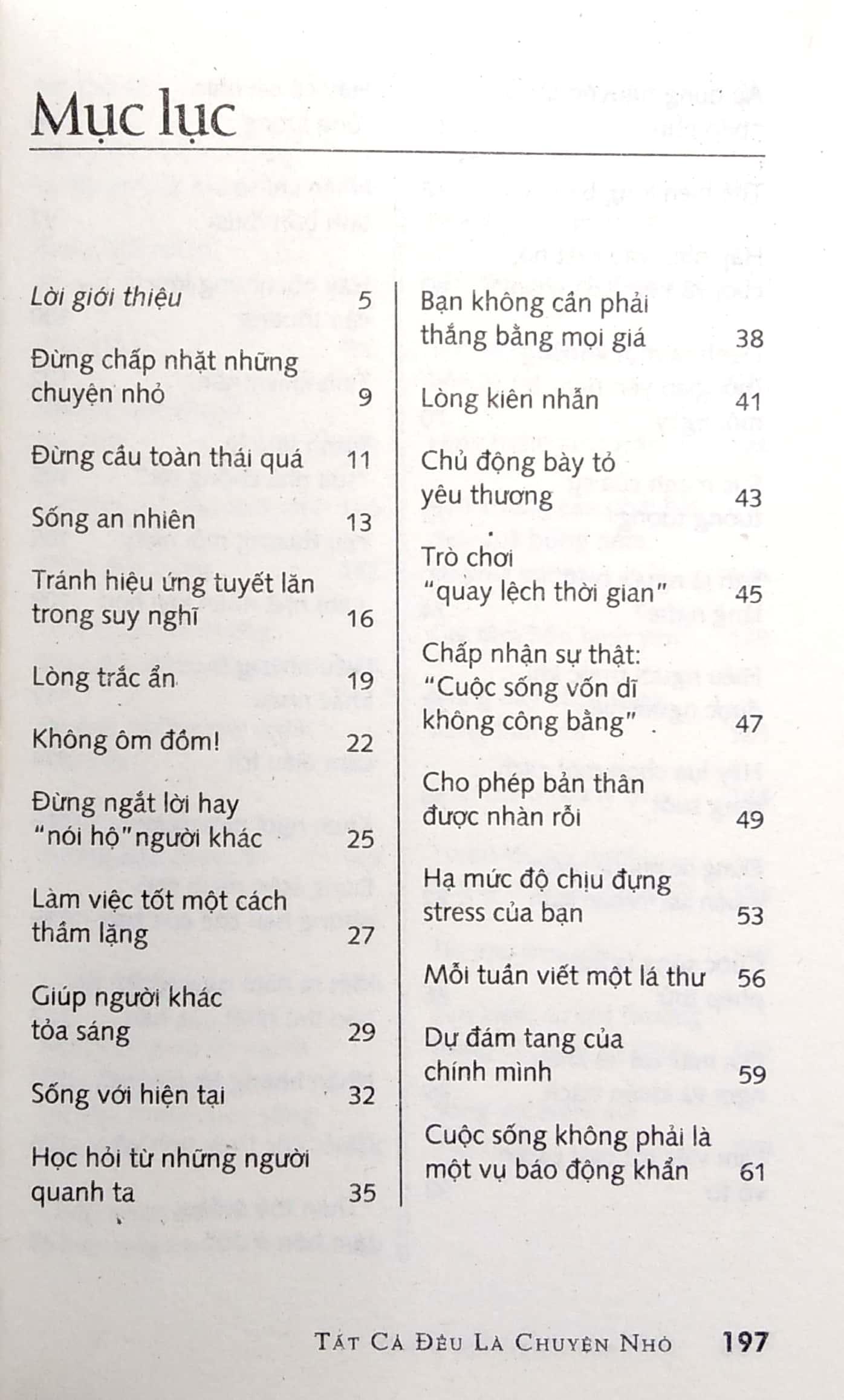 Được khái quát thành 81 đề mục nhỏ với những mẩu chuyện, những lời khuyên, chia sẻ hoặc dẫn chứng về nội dung đang được đề cập, cuốn sách là một cẩm nang sống tuyệt vời. Qua “Tất cả đều là chuyện nhỏ”, Richard Carlson chia sẻ với các bạn lần lượt từng bí quyết nhỏ nhưng mang lại hiệu quả lớn - những điều bạn có thể thực hiện ngay từ hôm nay - để có một cuộc sống nhẹ nhàng thư thái, không bị vướng bận bởi những chuyện vặt vãnh, chẳng hạn như: