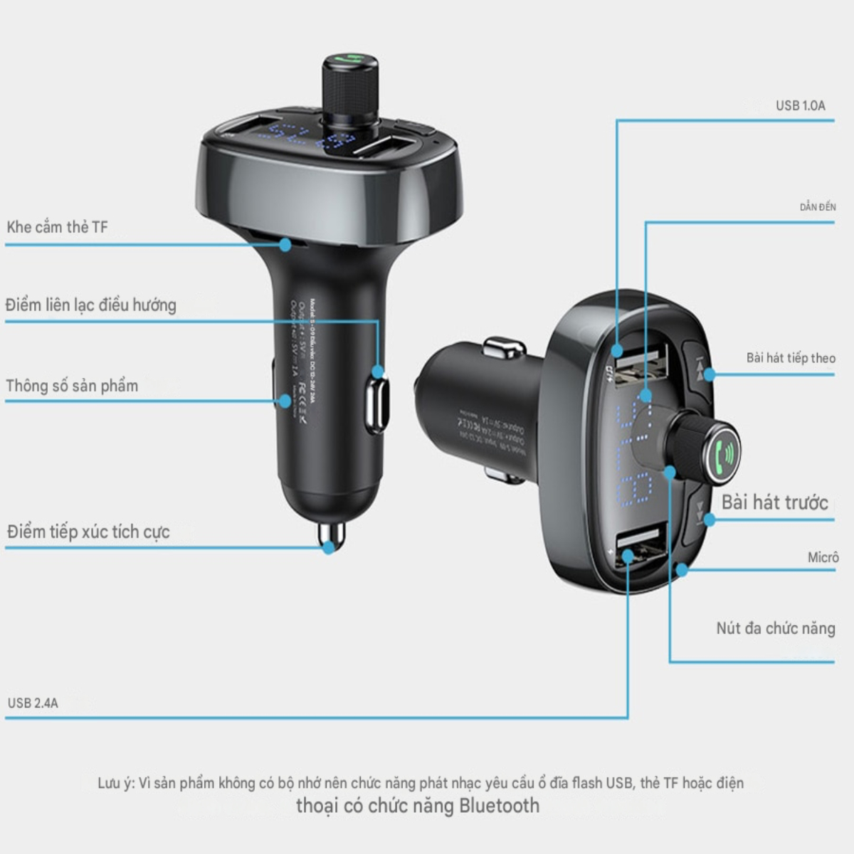 - Hỗ trợ phát nhạc: Bluetooth / USB / TF / AUX