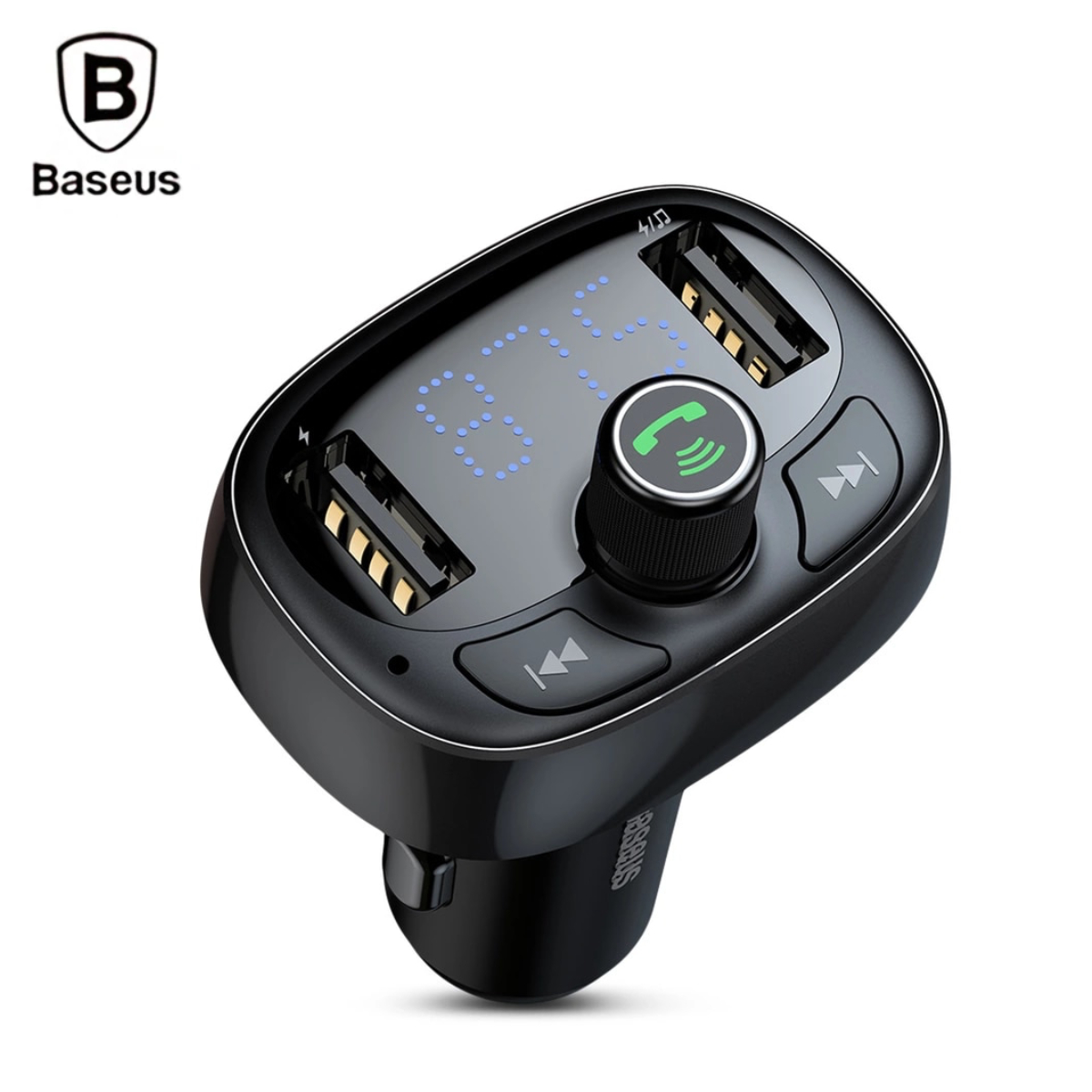 - Baseus T Shaped S-09 được trang bị hai cổng USB, trong đó có một cổng hỗ trợ sạc nhanh với dòng ra tối đa 3.4A, giúp sạc nhanh các thiết bị như điện thoại, máy tính bảng ngay cả khi đang sử dụng MP3. Màn hình LED hiển thị thông minh