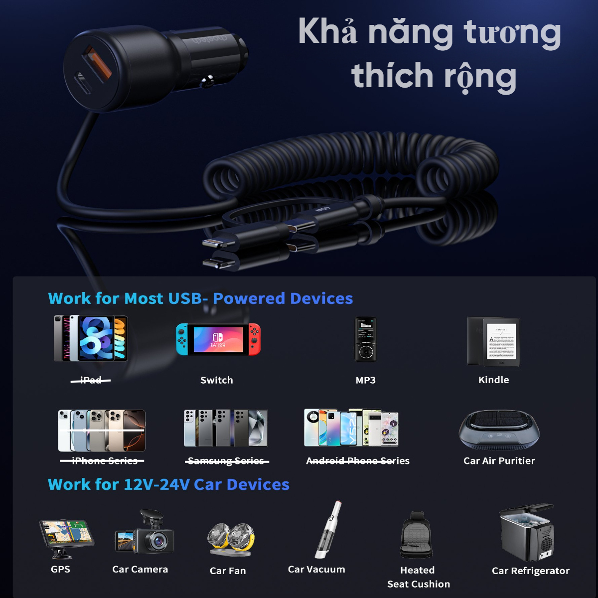 ✨Tẩu sạc nhanh 2 cổng trên ô tô 110W Choetech TC0038 tích hợp cáp lò xo Type C kèm đầu nối IP dài 1.5M (Hàng chính hãng)