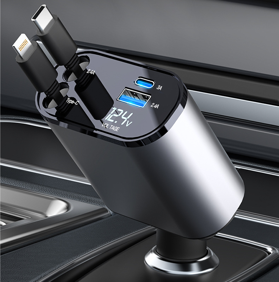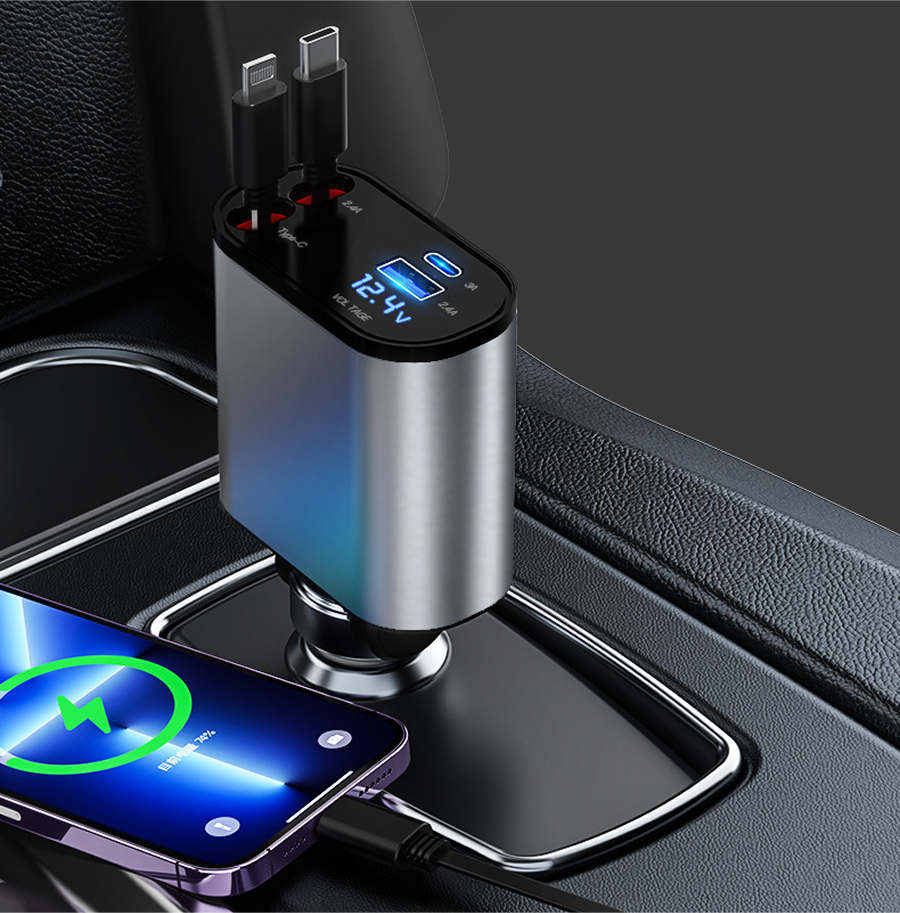 Tẩu Sạc Nhanh Xe Ô Tô TÍCH HỢP DÂY Sạc Type C, Lightning 100W | Hiển Thị Thông Số Sạc, Dây Rút Chống Rối, 4in1 Thuận tiện: Bộ sạc ô tô USB này có thiết