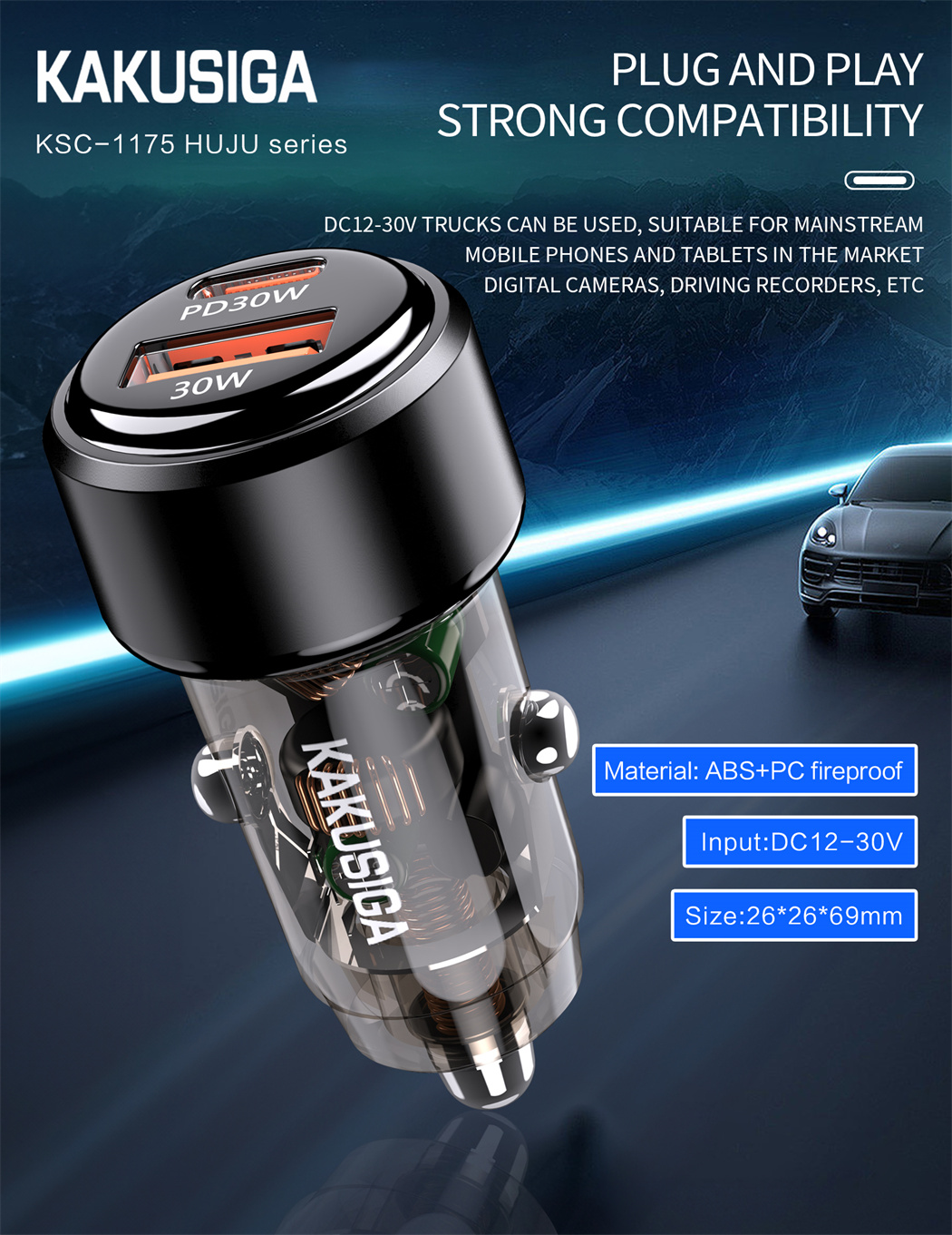 Tẩu sạc Ô tô trong suốt KAKU KSC-1175 (USB + Type C pd) – 60W Đặc điểm nổi bật – Thiết kế trong suốt có thể nhìn được vào Main bên trong – Chip thông
