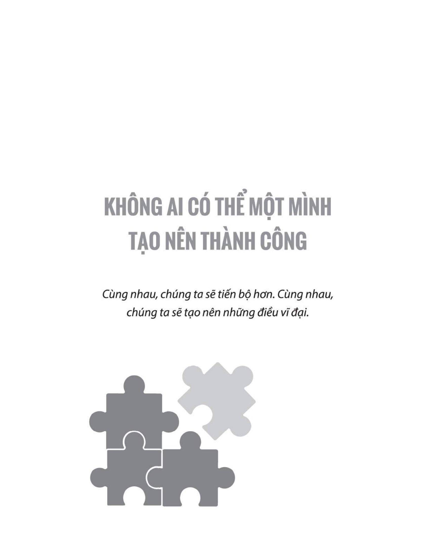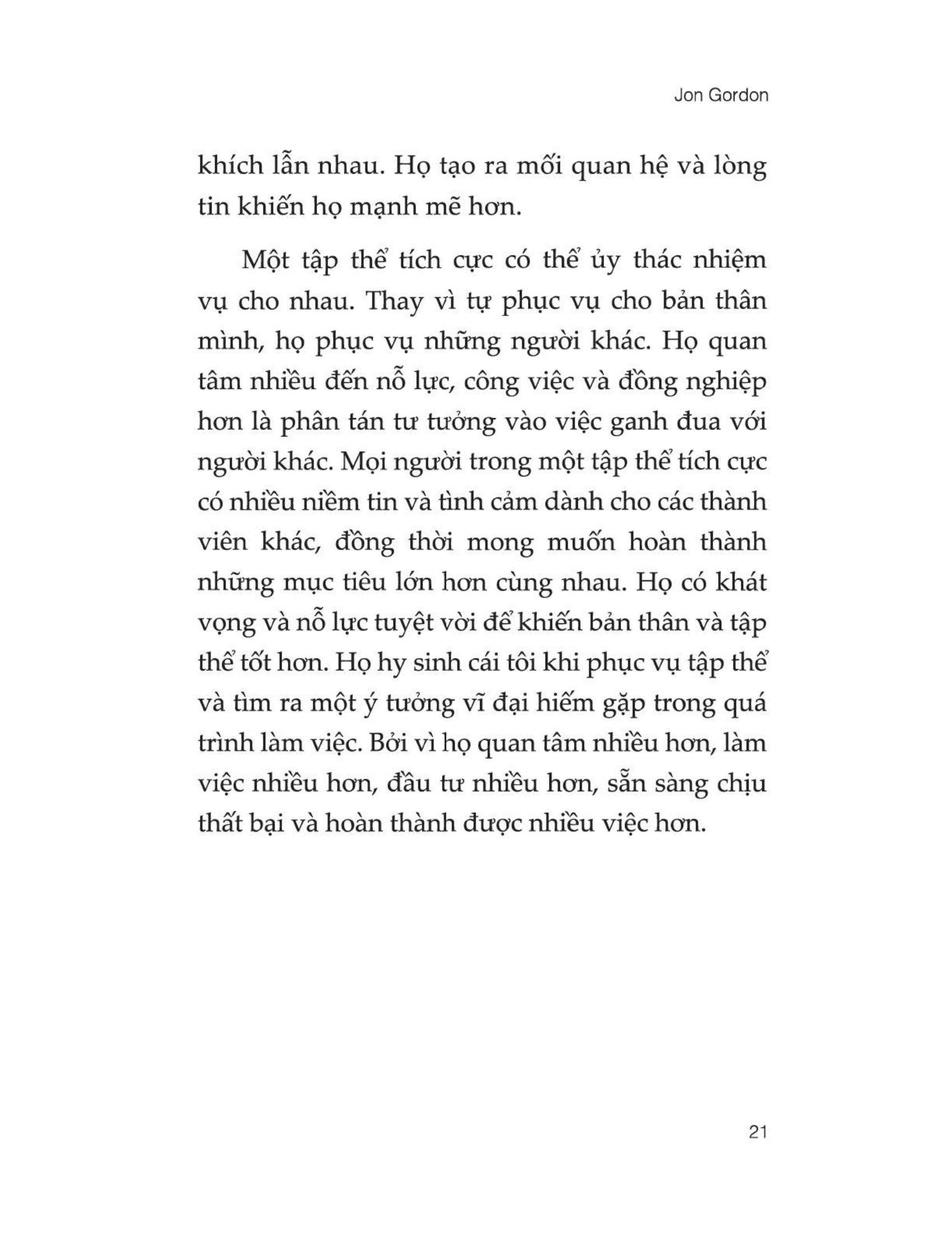 “Muốn đi nhanh hãy đi một m.ình, muốn đi xa hãy đi cùng nhau”. Không ai có thể một m.ình làm nên điều vĩ đại. Có một sự thật rằng, đằng sau những điều vĩ đại đều có công sức của cả một tập thể tích cực làm việc và cống hiến tận tâm. Tác giả Jon Gordon cho rằng để đạt được mục tiêu chung, những thành viên trong cùng một tập thể phải biết kiến tạo và chia sẻ tầm nhìn, sứ mệnh, làm việc với nhau dựa trên niềm tin, sự tích cực, tinh thần lạc quan; trao cho nhau sự kết nối, cam kết và quan tâm.