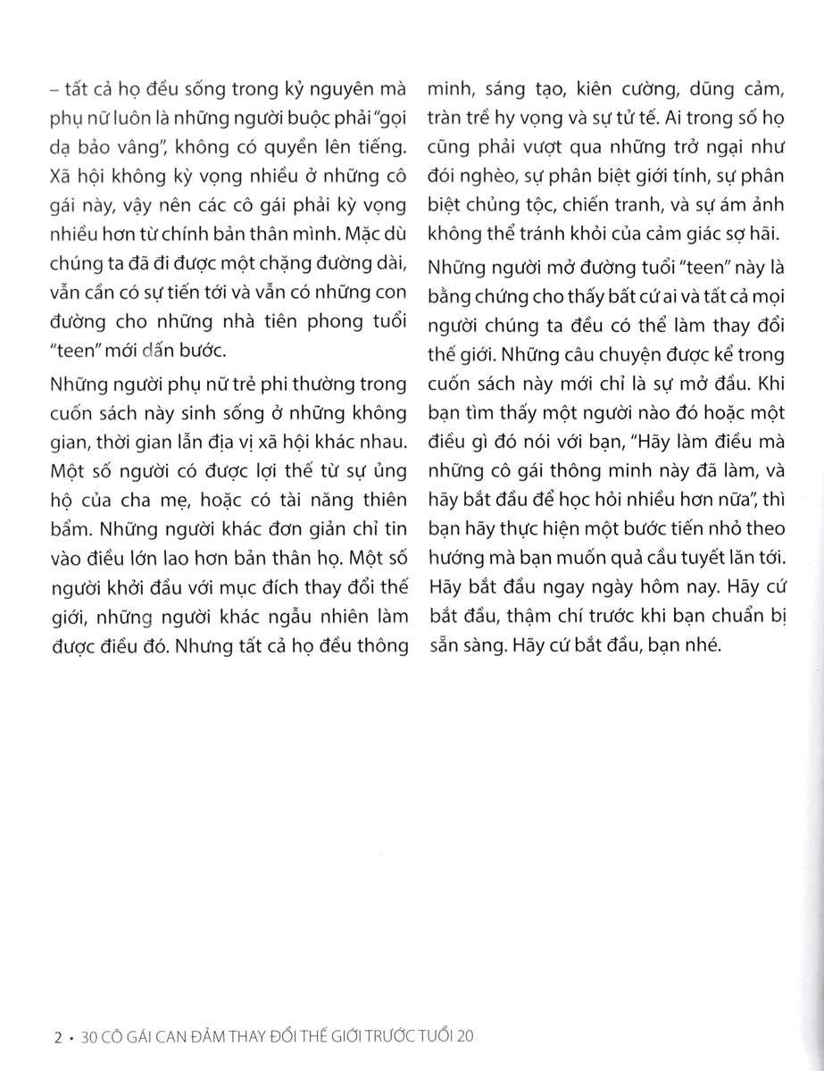 Những người phụ nữ trẻ phi thường trong cuốn sách này khác nhau ở mọi khía cạnh – nơi sinh sống, thời gian sống, địa vị xã hội. Một số người có được lợi thế từ sự ủng hộ của cha mẹ, hoặc có tài năng thiên bẩm. Những người khác đơn giản chỉ tin vào điều lớn lao hơn bản thân họ. Một số người khởi đầu với mục đích thay đổi thế giới, những người khác ngẫu nhiên làm được điều đó. Nhưng tất cả họ đều thông minh, sáng tạo, kiên cường, dũng cảm, tràn trề hy vọng, và sự tử tế. Ai trong số họ cũng phải vượt qua những trở ngại như đói nghèo, sự phân biệt giới tính, sự phân biệt ch.ủng tộc, chiến tranh, và sự ám ảnh không thể tránh khỏi của cảm giác sợ hãi.