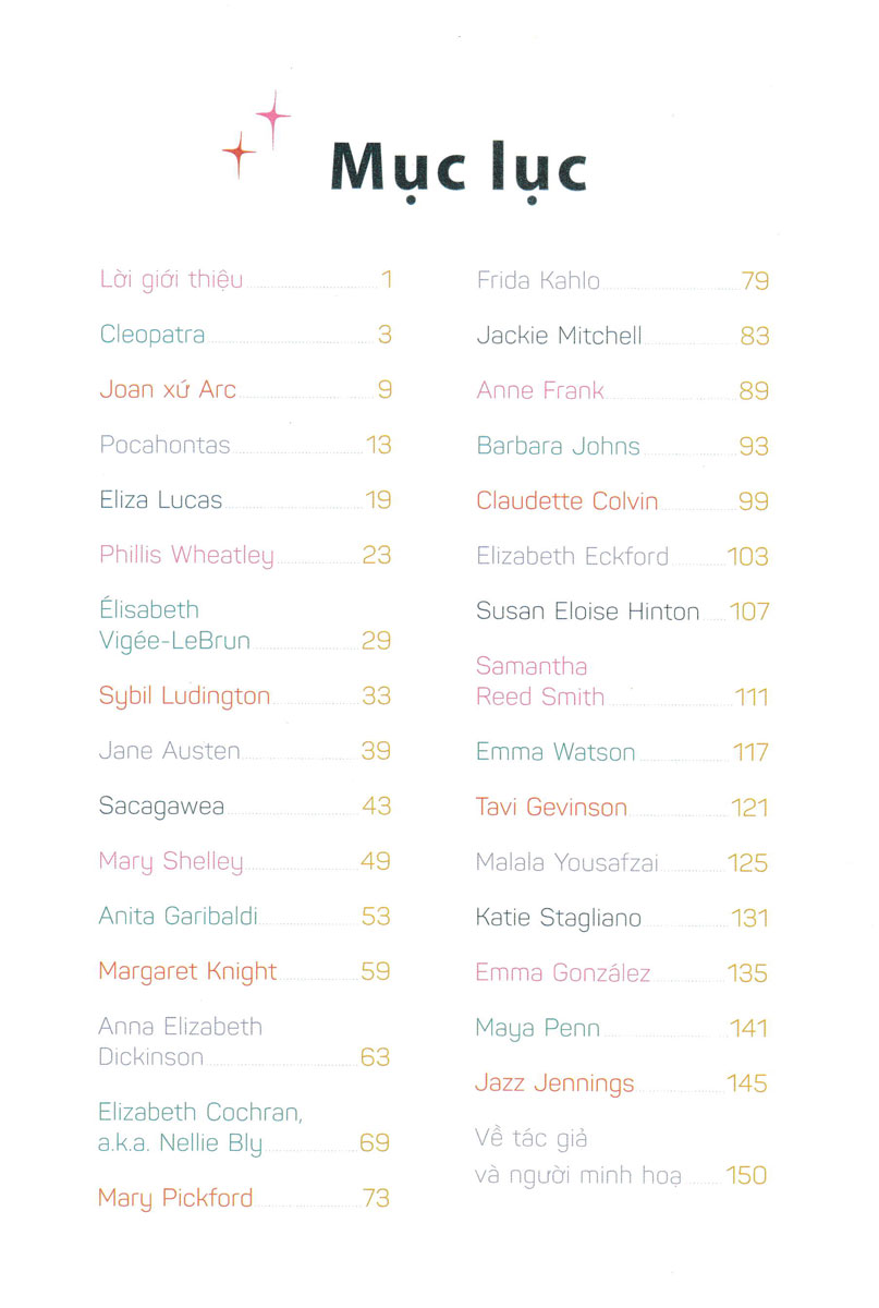 Ngày nay chúng ta may mắn: hầu hết phụ nữ có được sự tự do và sự tự tin để đi theo bất cứ hướng nào mình thích. Chúng ta cũng có những người đi trước làm hình mẫu. Họ đã mở đường cho chúng ta. Nhưng các cô gái trong cuốn sách này thường là những người tiên phong trong lĩnh vực của họ, không có ai để noi theo ngoài chính bản thân mình. Mary Shelly xuất bản tiểu thuyết khoa học đầu tiên trong lịch sử, Mary Pickford tạo ra một ngôi sao điện ảnh, còn Nellie Bly đi tiên phong trong mảng phóng sự điều tra – tất cả đều sống trong kỷ nguyên mà phụ nữ được bảo phải ngồi yên và không được lên tiếng. Xã hội không kỳ vọng nhiều ở những cô gái này, vậy nên họ phải kỳ vọng nhiều hơn từ chính bản thân mình. Mặc dù chúng ta đã đi được một chặng đường dài, vẫn cần có sự tiến tới và và vẫn có những con đường cho những nhà tiên phong tuổi “teen” mới dấn bước.