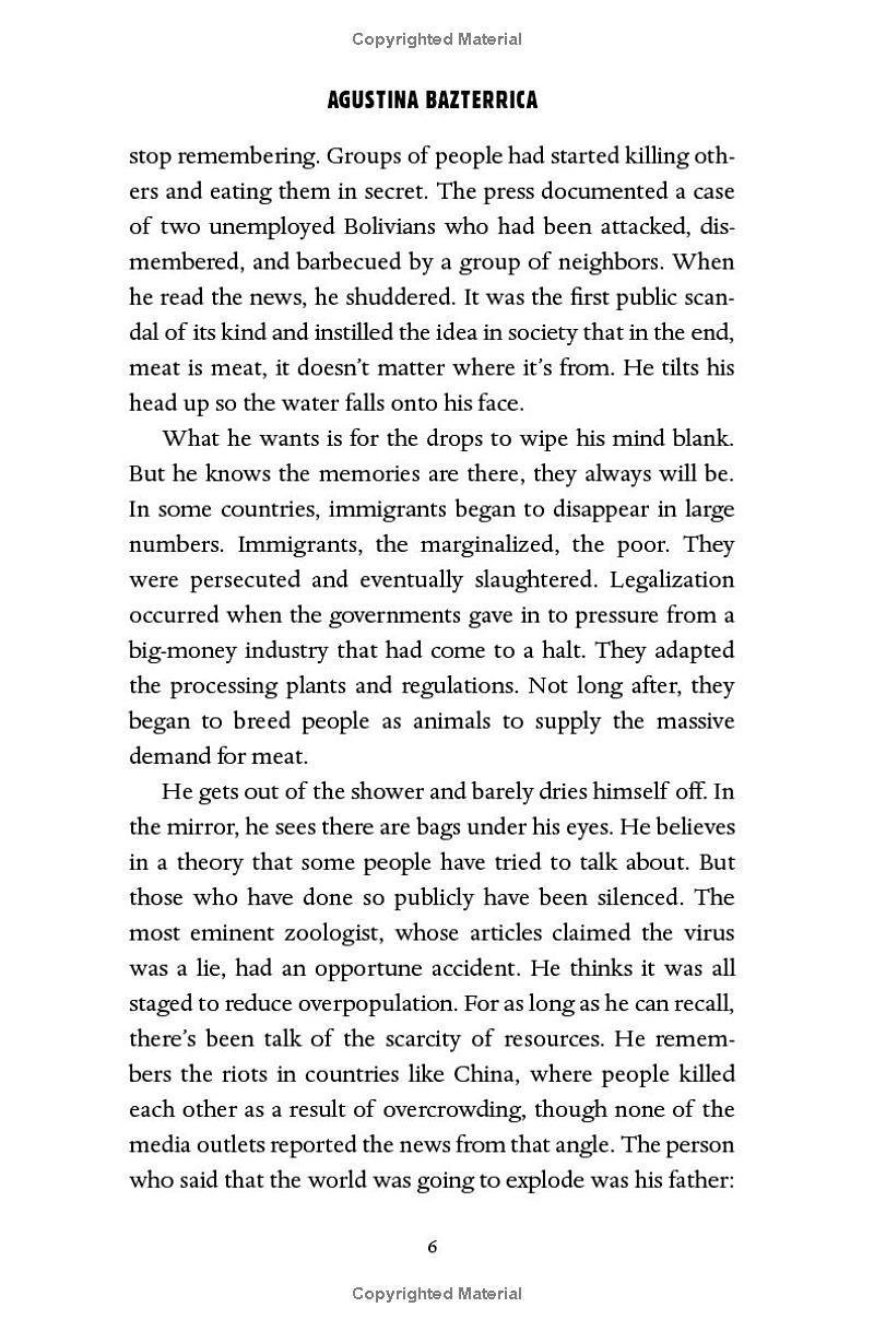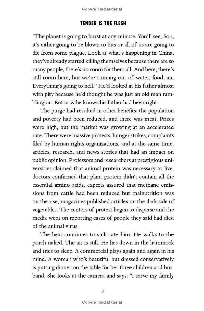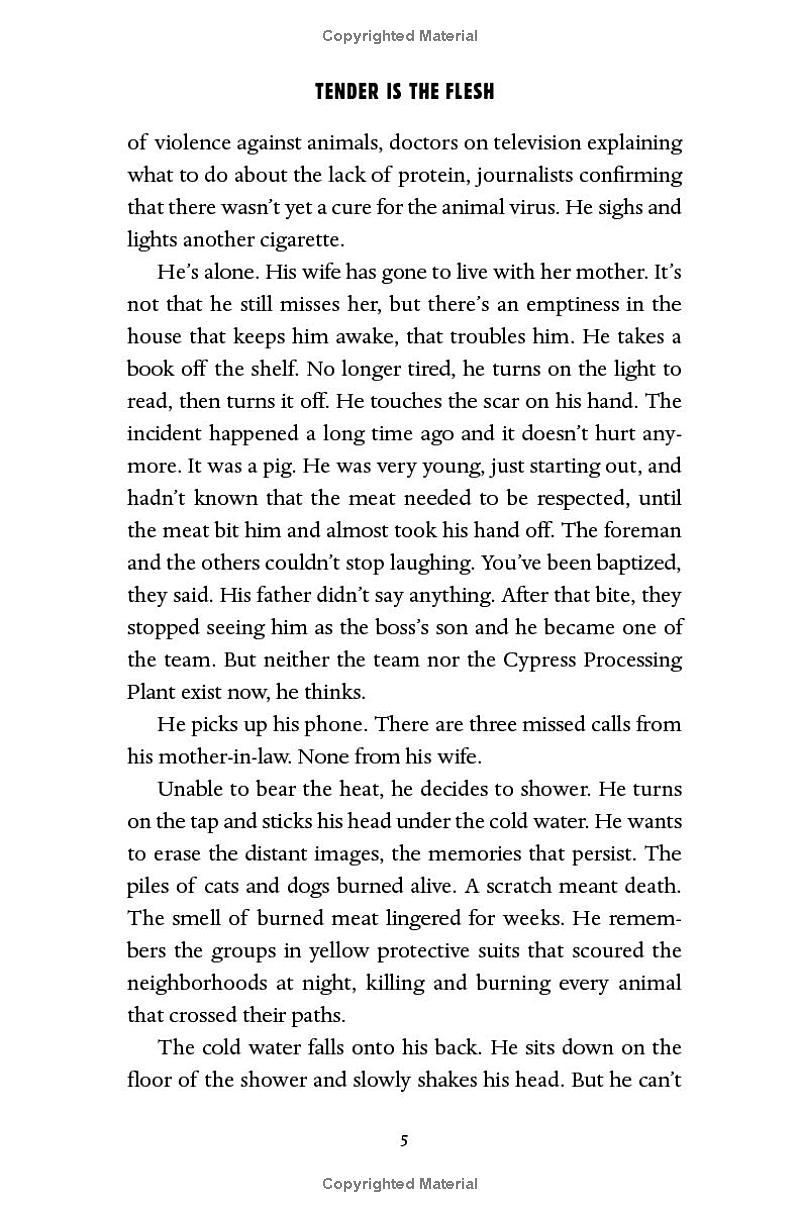 Tender Is The Flesh Working at the local processing plant, Marcos is in the business of slaughtering humans—though no one calls them that anymore. His wife has left him, his father is sinking into dementia, and Marcos tries not to think too hard about how he makes a living. After all, it happened so quickly. First, it was reported that an infectious virus has made all animal meat poisonous to humans. Then governments initiated the “Transition.” Now, eating human meat—“special meat”—is legal. Marcos tries to stick to numbers, consignments, processing. Then one day he’s given a gift: a live specimen of the finest quality. Though he’s aware that any form of personal contact is forbidden on pain of death, little by little he starts to treat her like a human being. And soon, he becomes tortured by what has been lost—and what might still be saved.