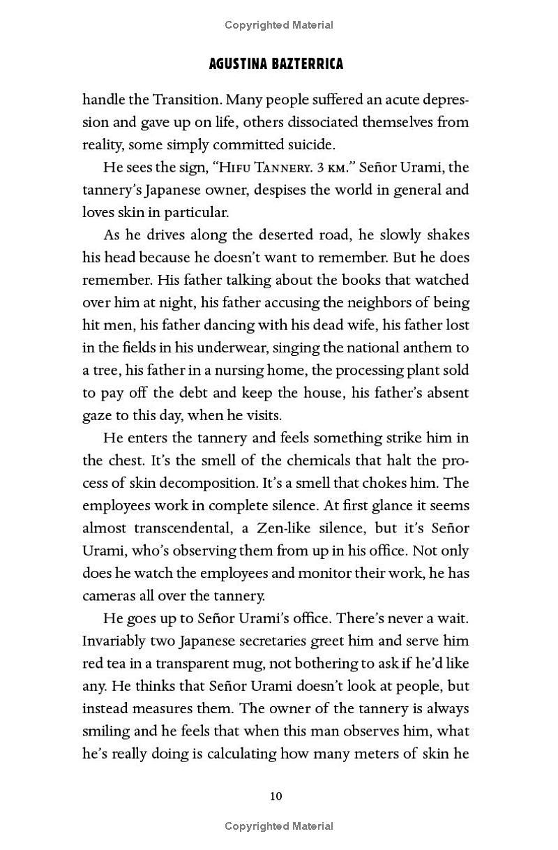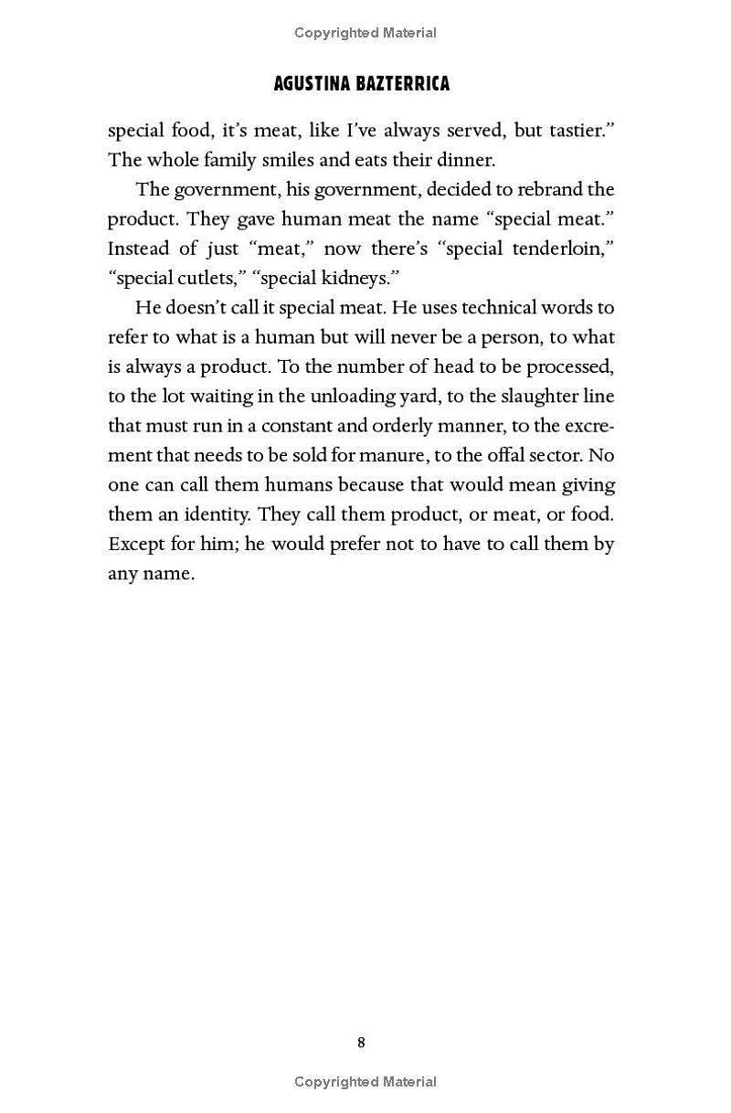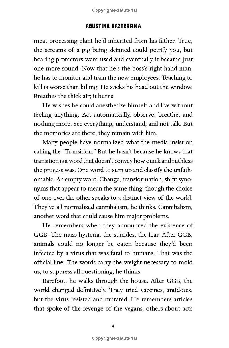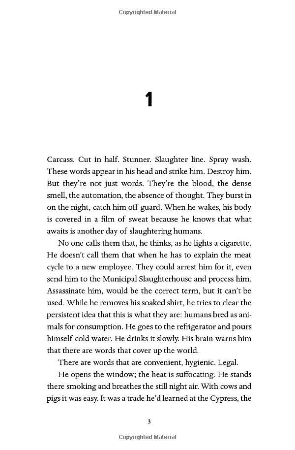 Tender Is The Flesh Working at the local processing plant, Marcos is in the business of slaughtering humans—though no one calls them that anymore. His wife has left him, his father is sinking into dementia, and Marcos tries not to think too hard about how he makes a living. After all, it happened so quickly. First, it was reported that an infectious virus has made all animal meat poisonous to humans. Then governments initiated the “Transition.” Now, eating human meat—“special meat”—is legal. Marcos tries to stick to numbers, consignments, processing. Then one day he’s given a gift: a live specimen of the finest quality. Though he’s aware that any form of personal contact is forbidden on pain of death, little by little he starts to treat her like a human being. And soon, he becomes tortured by what has been lost—and what might still be saved.