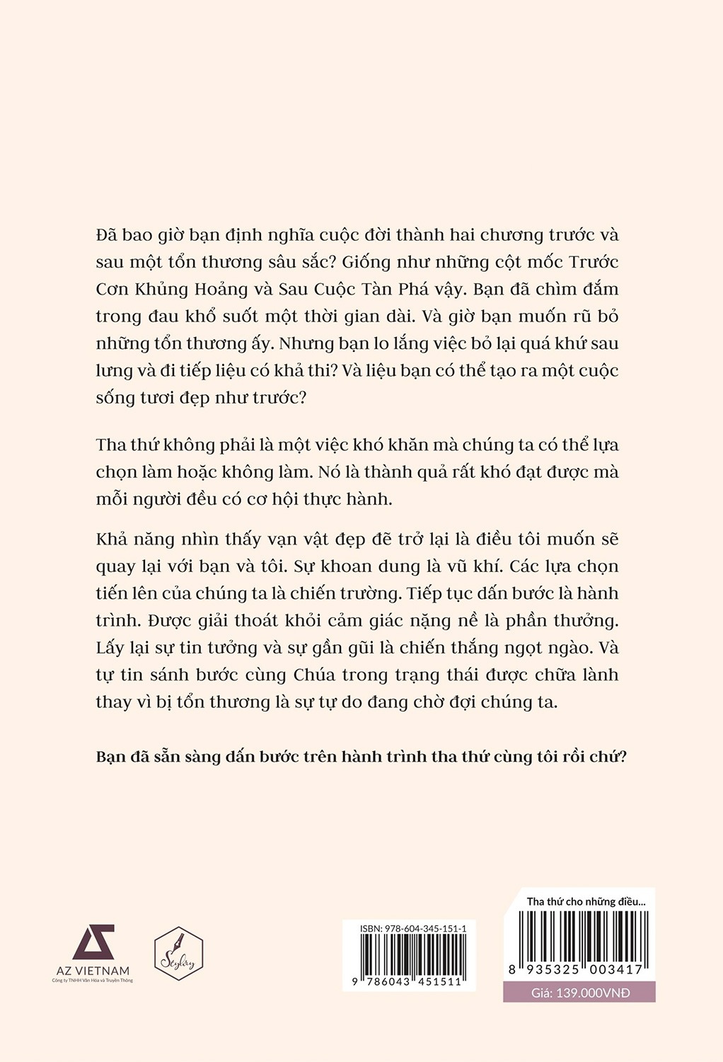 Cuốn sách “Tha thứ cho những điều bạn không thể lãng quên” là bản tiếng Việt của cuốn sách “FORGIVING WHAT YOU CAN'T FORGET” vô cùng vô cùng nổi tiếng, cuốn sách này là câu chuyện vô cùng chân thực của việc chữa lành sau tan vỡ và tổn thương. Đây là cuốn sách có hơi thở tôn giáo, với "sợi dây" mà tác giả đã bám vào trong lúc đau khổ vật vã chính là lời răn trong cuốn sách Kinh Thánh về Ân điển (Grace) và Lẽ thật (Trace). Cuốn sách không nặng nề tính tôn giáo, hay là một kiểu rao giảng đạo đức sáo rỗng và mụ mị. Nó có thể chạm đến trái tim người đọc, bởi chúng ta có thể cảm nhận được vô cùng chân thật sự chật vật của tác giả ngay cả khi cô ấy viết những dòng này. Luôn là những câu hỏi tại sao và “LIỆU MÌNH NÊN LÀM THẾ NÀO”, là 1 hành trình dài không ngừng chiêm nghiệm, tu dưỡng, học hỏi và tự vấn bản thân, để đến một ngày có thể thấu suốt mọi điều, và có thể đối mặt với tổn thương như với một người bạn từng quen lâu ngày mới gặp lại, có thể trao nhau nụ cười nhàn nhạt và hỏi những câu xã giao vô thưởng vô phạt kiểu "Bạn khỏe không?" "Cuộc sống ổn cả chứ?" Chúng ta không bao giờ có thể quên đi nỗi đau người khác đã gây ra cho mình. Nhưng chúng ta có thể học cách không để những nỗi đau ấy tàn phá mình, hủy hoại mình mãi mãi.! "Dù "họ" là ai trong câu chuyện của bạn, những việc họ làm đã khiến bạn bị tổn thương, họ đã tước đoạt thứ gì đó từ bạn và khơi mào cho một chuỗi sự kiện vẫn còn ảnh hưởng đáng kể đến bạn. Những gì họ làm là sai trái. Tôi nói như vậy không nhằm để chỉ trích họ. Tôi không nắm được mọi dữ kiện về những gì đã xảy ra và không đủ tư cách để trở thành người phán xét họ, nhưng tôi có thể là nhân chứng cho nỗi đau của bạn. Nỗi đau của bạn có thật. Và nỗi đau của tôi cũng thế. Nên nếu không ai công nhận điều này với bạn, tôi sẽ làm việc đó. Nhưng bạn thân mến, tôi có thể thì thầm với bạn điều mình đang học được ko? Ở lại đây, đổ lỗi cho họ và vĩnh viễn định nghĩa cuộc đời bạn bằng những việc họ đã làm sẽ chỉ khiến nỗi đau nhân lên gấp bội. Tệ hơn nữa, nó sẽ tiếp tục phóng chiếu lên người khác. Càng để nỗi đau dày vò, chúng ta sẽ càng bị nó kiểm soát. Buồn thay, chính những người không đáng bị tổn thương nhất lại phải chịu nhiều thiệt hại nhất do nỗi đau còn đang bỏ ngỏ của chúng ta gây ra. Cá nhân hoặc nhóm người đó - họ đã gieo rắc đủ đau đớn cho bạn, cho tôi và cho những người xung quanh chúng ta. Chúng ta đã phải chịu đủ hậu quả rồi. Những gì họ lấy đi thế là đã đủ. Đừng để nỗi đau này tiếp tục ảnh hưởng đến bạn nữa. Bạn có quyền quyết định mình sẽ tiến về phía trước bằng cách nào!"