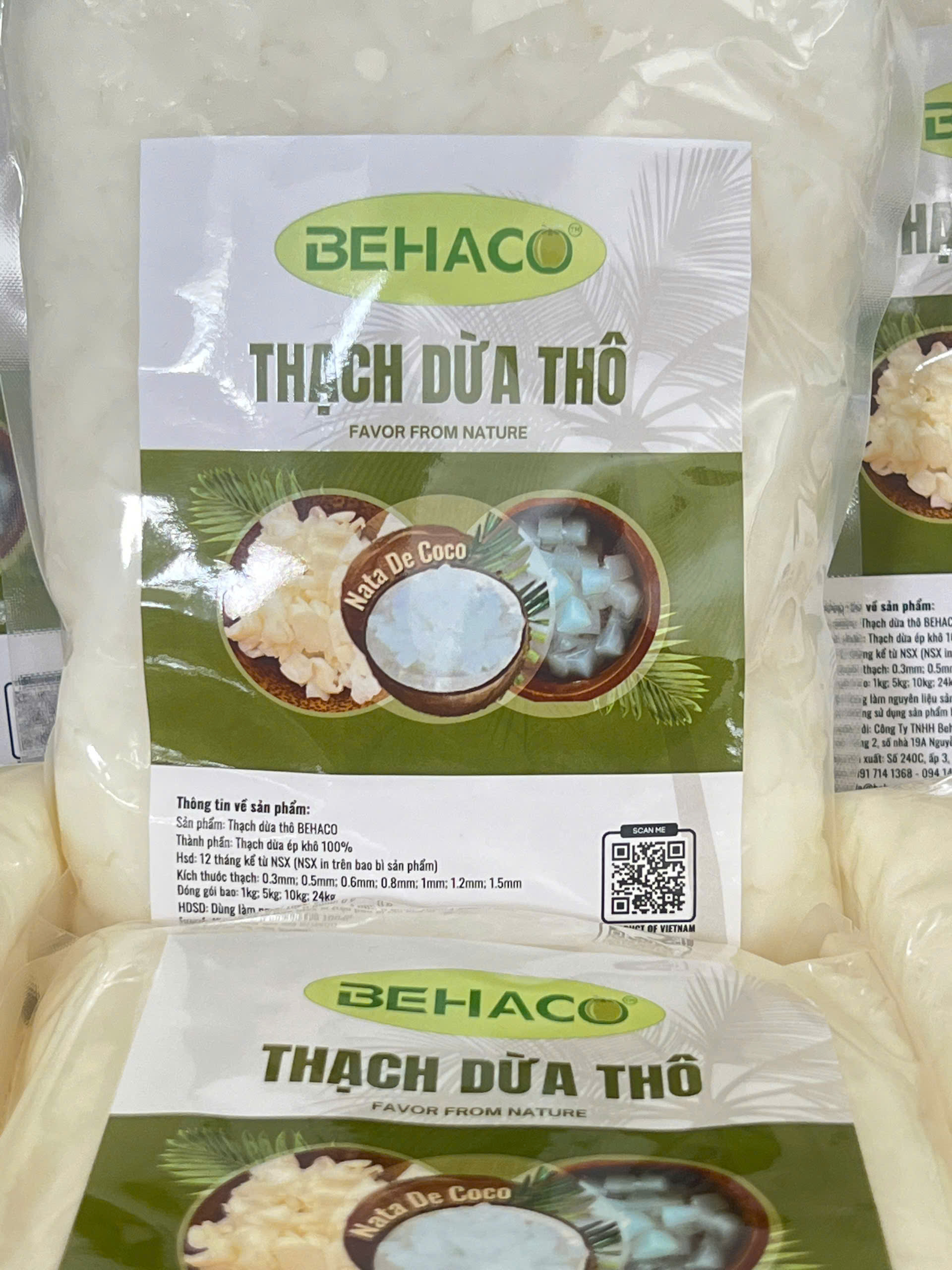 Mua tại TiktokTHẠCH DỪA ÉP KHÔ BEHACO - 5 LY Thạch dừa thô là lớp Hemicellulose, sản phẩm sinh khối đươc tạo thành bởi sự lên men của vi khuẩn Acetobacter xylinum trong môi trường nước dừa già bổ sung các chất dinh dưỡng cần thiết tốt cho sức khỏe. Thạch dừa thô được sản xuất tại Công Ty TNHH Behaco Bến Tre Việt Nam.
