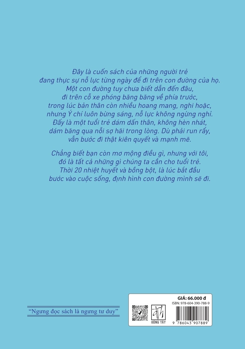 Đây là cuốn sách của những người trẻ đang thực sự nỗ lực từng ngày để đi trên con đường của họ. Một con đường tuy chưa biết dẫn đến đâu, đi trên cỗ xe phóng băng băng về phía trước, trong lúc bản thân còn nhiều hoang mang, nghi hoặc, nhưng Ý chí luôn bừng sáng, nỗ lực không ngừng nghỉ. Đấy là một tuổi trẻ dám dấn thân, không hèn nhát, dám băng qua nỗi sợ hãi trong lòng. Dù phải run rẩy, vẫn bước đi thật kiên quyết và mạnh mẽ.
