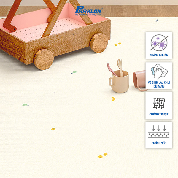 Mua tại TiktokThảm Trẻ Em Hàng Đầu Thế Giới Nhập Khẩu Chính Hãng Hàn Quốc Parklon Thương hiệu: Parklon Xuất xứ: Hàn Quốc Chất liệu: Nhựa PVC Họa tiết: Trái cây cao cấp Kích thước: 210cm x 140cm x 1.5cm Độ bền: 10 năm THẢM TRẺ EM HÀNG ĐẦU THẾ GIỚI CHÍNH HÃNG PARKLON: Bảo vệ con bạn khỏi sàn nhà cứng khi các bé tập bò, tập đứng hay tập đi. Thảm trẻ em Parklon được thiết kế đặc biệt để hấp thụ tác động và mang lại sự thoải mái hàng giờ cho các bé. ★ Chất liệu cao cấp được nhập khẩu từ Đức, kết hợp với công nghệ tiên tiến nhất của Parklon để tạo nên những chiếc thảm trẻ em hoàn hảo nhất. ★ Công nghệ chống sốc, chống va đập và giảm tiếng ồn được cải tiến giúp trẻ thoải mái vui chơi. ★ Thiết kế 2 mặt với hoa văn đặc biệt chống trơn trượt và công nghệ bo góc đặc biệt không gây nguy hiểm cho bé. ★ Công nghệ Nano kháng khuẩn quanh năm, không gây dị ứng, an toàn ngay cả với làn da của trẻ sơ sinh. ★ Khả năng chống nước 100% và dễ dàng vệ sinh, chỉ cần lau sạch vết bẩn bằng khăn. ★ Bề mặt thảm mềm mại, êm ái kết hợp cùng chất liệu đặc biệt giúp giữ ấm vào mùa đông, không nóng vào mùa hè. ★ Chất liệu thân thiện với môi trường, không chứa các chất độc hại và kim loại nặng. ★ Đạt chứng nhận an toàn từ tổ chức toàn cầu: KC, SGS, ISO 9001, An toàn Châu Âu EN71
