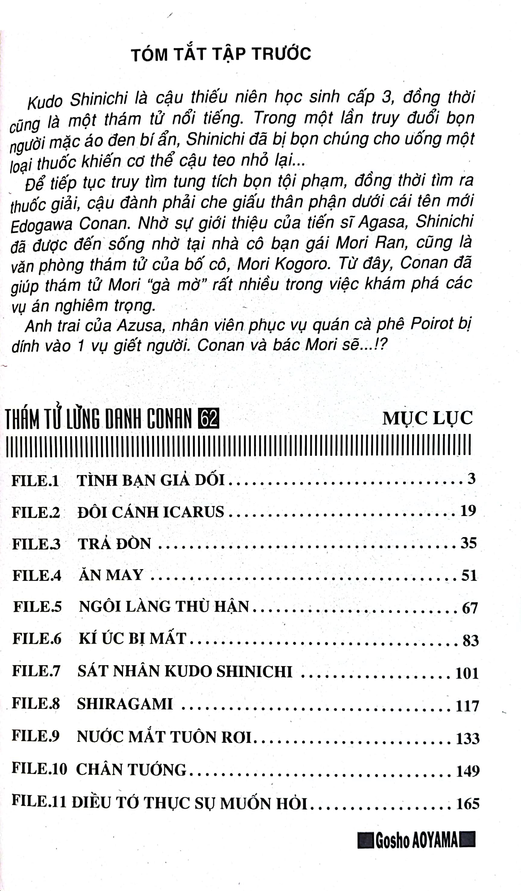 Thám Tử Lừng Danh Conan - Tập 62 Đáp ứng mong mỏi của fan, lâu rồi Conan mới trở về là Shinichi. Nhưng lần này, có gì đó hơi khác!? Có vẻ như Shinichi đã mất hết trí nhớ nhưng thực ra đằng sau nó ẩn chứa một bí mật kinh hoàng! Trong tập này cũng có "Chiếc áo sơ mi trắng dính máu" và "Lật tẩy bằng chứng ngoại phạm giả của nữ võ sĩ Judo"!