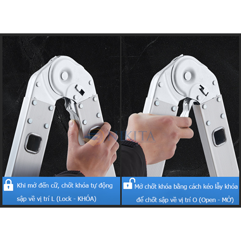 Thang nhôm chữ A, khóa sập tự động, bậc thang đột 3 nấc chắc chắn - Hàng chính hãng NIKITA Chất liệu : Nhôm Màu sắc : Bạc Tải trọng 200kg, tiêu chuẩn châu