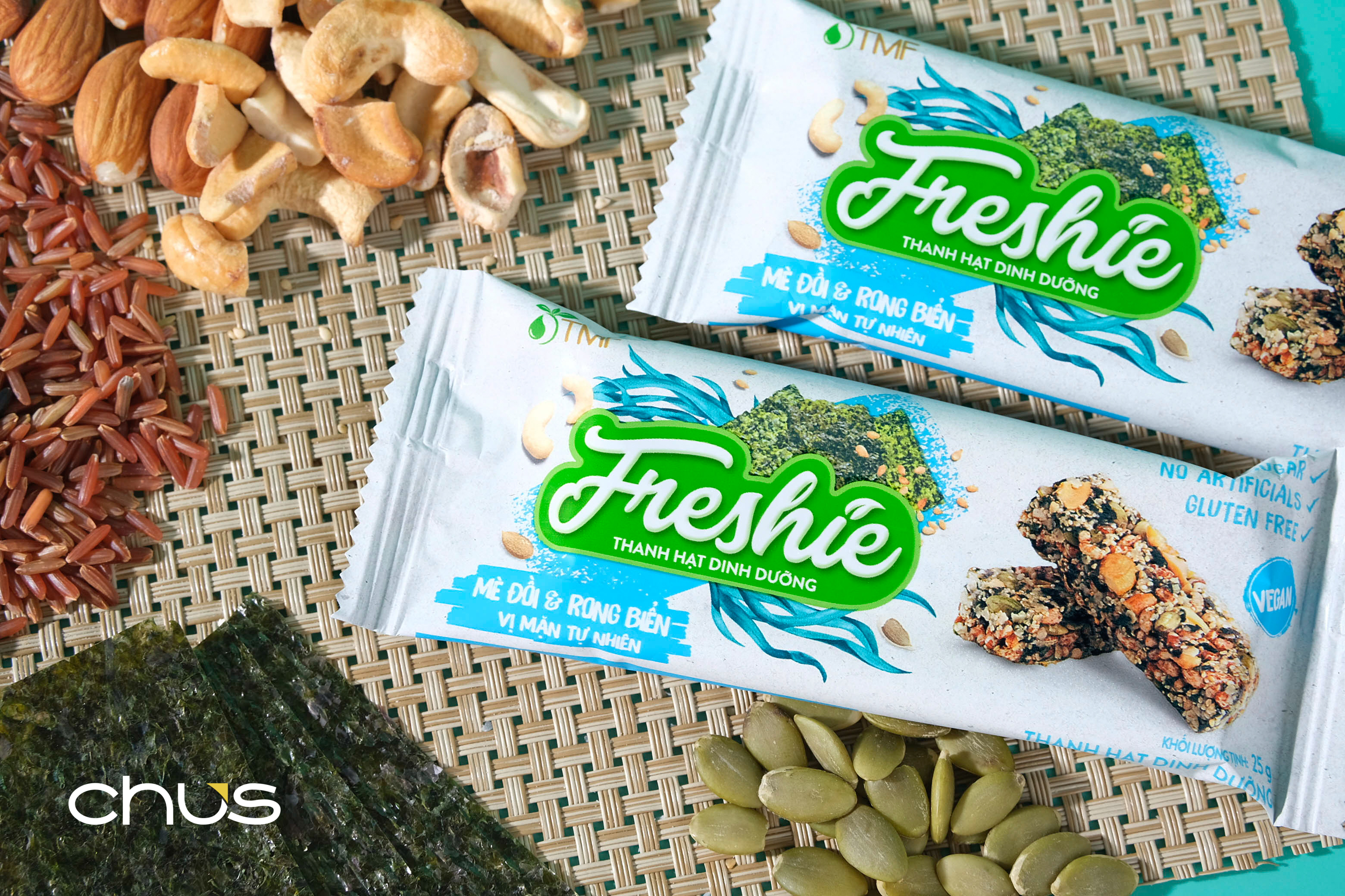 “You’re Fresh – You’re The Best”  ->  Thanh Hạt Dinh Dưỡng Freshie của TMF mang đến nguồn năng lượng tươi mới, khi ăn thanh Freshie bạn sẽ cảm thấy như được tiếp sức trẻ năng động, tự tin, sáng tạo để học tập, làm việc và trở thành “the best version” - phiên bản tốt nhất của chính mình.     Thanh hạt dinh dưỡng Freshie được làm từ các nông sản thuần Việt, không chứa đường tinh luyện, không hương liệu và chất bảo quản, an toàn cho sức khỏe. Với thông điệp You’re fresh, You’re the best, Năng lượng tươi mới - khởi sự tuyệt vời, thanh hạt dinh dưỡng Freshie là sự lựa chọn hoàn hảo, bổ sung năng lượng trước khi bắt đầu bất kỳ hoạt động nào; giúp bạn trở nên năng động và có một khởi đầu tuyệt vời hơn bao giờ hết. Hãy thử Freshie và cảm nhận sự khác biệt nhé!   Điểm khác biệt của Freshie _100% thuần thực vật _Sử dụng mật dừa nước tạo độ ngọt thanh _Không chiên qua dầu _Không sử dụng đường tinh luyện _Không chất bảo quản, hương liệu, phẩm màu _Các loại hạt chọn lọc cao cấp _Phù hợp mọi lứa tuổi _Dây chuyền sản xuất khép kín, hiện đại     Thành phần: Gạo lứt, hạt điều, hạt bí, mè đồi, rong biển, mạch nha, mật dừa nước, dầu cọ, muối Himalaya Bảo quản: Bảo quản nơi khô ráo và tránh ánh nắng mặt trời. Hạn sử dụng: 12 tháng kể từ ngày sản xuất   Sản xuất tại: CÔNG TY TNHH THỰC PHẨM TÂM MINH. Tiêu chuẩn nhà máy: ISO22000:2018, FDA