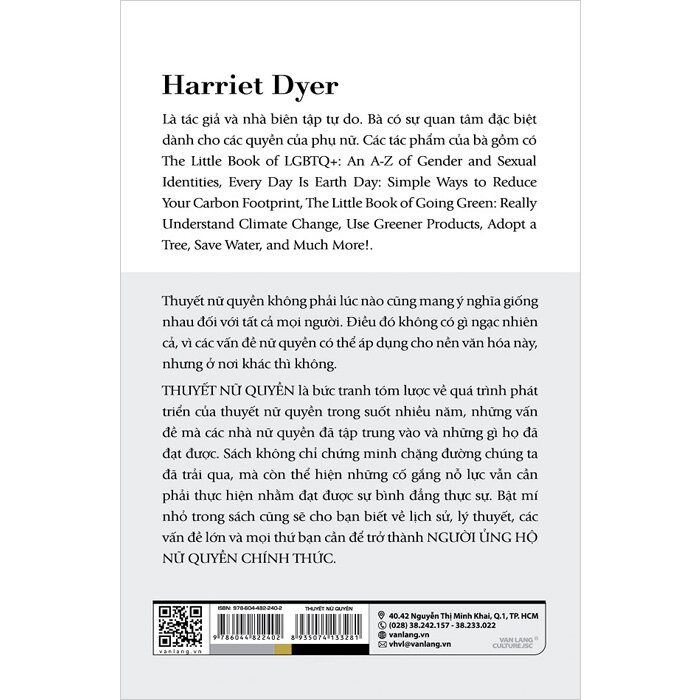 Harriet Dyer Là tác giả và nhà biên tập tự do. Bà có sự quan tâm đặc biệt dành cho các quyền của phụ nữ. Các tác phẩm của bà gồm có The Little Book of LGBTQ+: An A-Z of Gender and Sexual Identities, Every Day Is Earth Day: Simple Ways to Reduce Your Carbon Footprint, The Little Book of Going Green: Really Understand Climate Change, Use Greener Products, Adopt a Tree, Save Water, and Much More!.