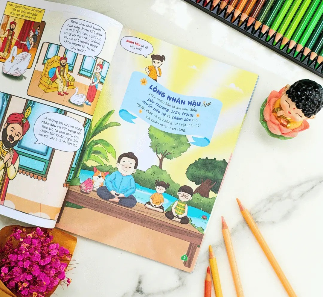 Nhân hậu thật giản đơn là quyển mới ra mắt nằm trong bộ sách Thiện lành như Phật được thầy Thích Nhật Từ chủ biên. Ngoài ra, đây cũng là bộ truyện tương tác “chơi mà học” về chủ đề Phật giáo đầu tiên tại Việt Nam.