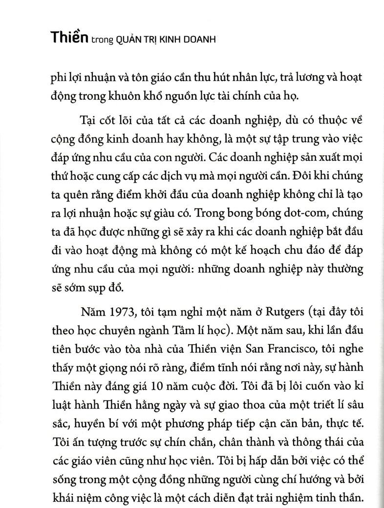 Qua Thiền Trong Quản Trị Kinh Doanh, Marc Lesser cuốn sách Marc Lesser cung cấp cho bạn đọc cá công cụ,ý tưởng có thể giúp bạn tự tin trong nổ lực nhìn nhận bản thân,công việc của mình và thế giới theo đúng bản chất của chúng.Tích hợp Thiền với thực tiễn kinh doanh không chỉ giúp chúng ta khám phá ra công việc và bản thân mình,mà còn giúp ta vượt qua giới hạn,trải nghiệm cuộc đời theo cách trọn vẹn nhất,cả sự nguyen sơ cũng như sự bao la,rộng lớn của nó.