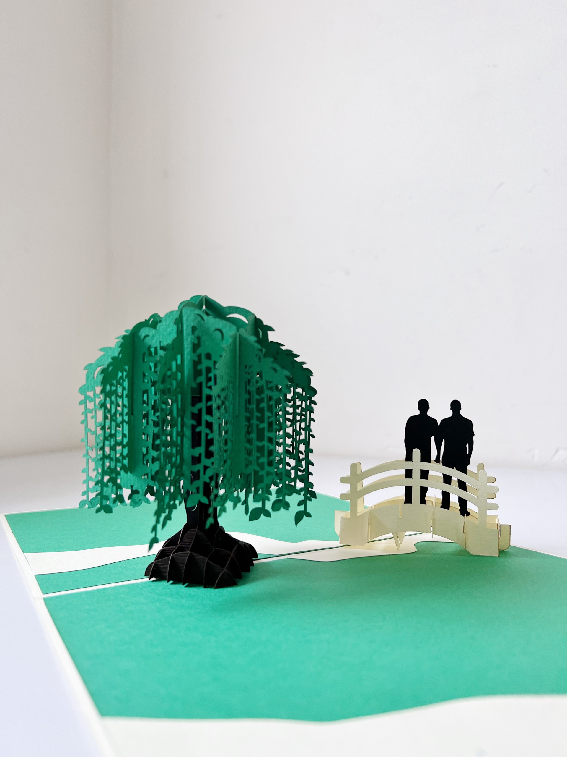 Thể hiện sự tự do và tình yêu chân thành với thiệp 3D Pop Up cặp đôi LGBT. Khi mở ra, hình ảnh hai người nắm tay nhau cùng đi trên cây cầu nhỏ dưới bóng cây liễu xanh mát bật nổi đầy sống động, mang lại cảm giác lãng mạn và ý nghĩa. Thiệp phù hợp làm quà tặng trong các dịp Valentine, kỷ niệm tình yêu, sinh nhật người thương hoặc các dịp quan trọng để khẳng định sự gắn kết và tình cảm đặc biệt. Đặc điểm nổi bật (Bullet points)