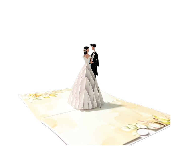 Gửi lời chúc phúc ý nghĩa với thiệp 3D Pop Up cô dâu váy trắng và chú rể. Khi mở ra, hình ảnh đôi uyên ương bật nổi, cô dâu trong chiếc váy trắng bồng