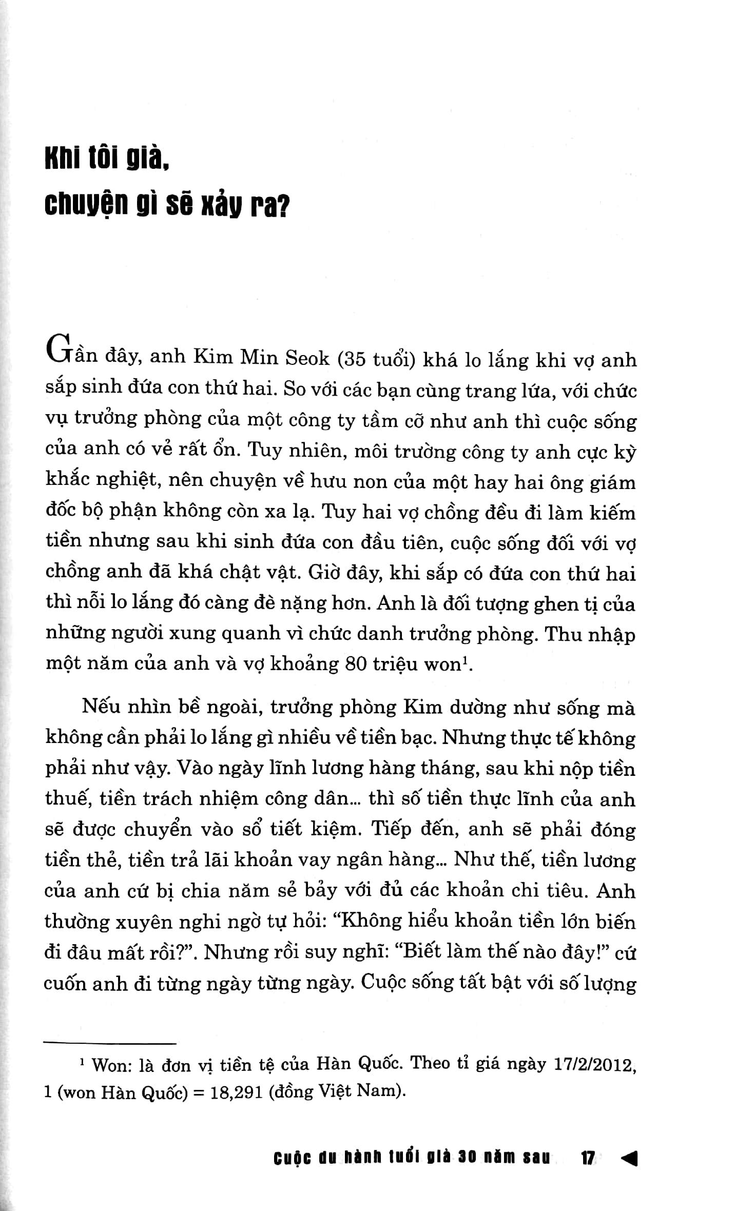 Chúng tôi mong rằng những độc giả ở tầm tuổi 20, 30 sẽ đọc và tập trung vào vấn đề"tại sao phải chuẩn bị cho tuổi già ngay từ bây giờ"theo cách nhìn nhận của nhân vật chính. Nếu là độc giả ở tầm tuổi tứ tuần hoặc đầu ngũ tuần thì dù có hơi muộn một chút cũng hãy tập trung vào việc phải lựa chọn những phương pháp nào để bù đắp lại thời gian đã mất.