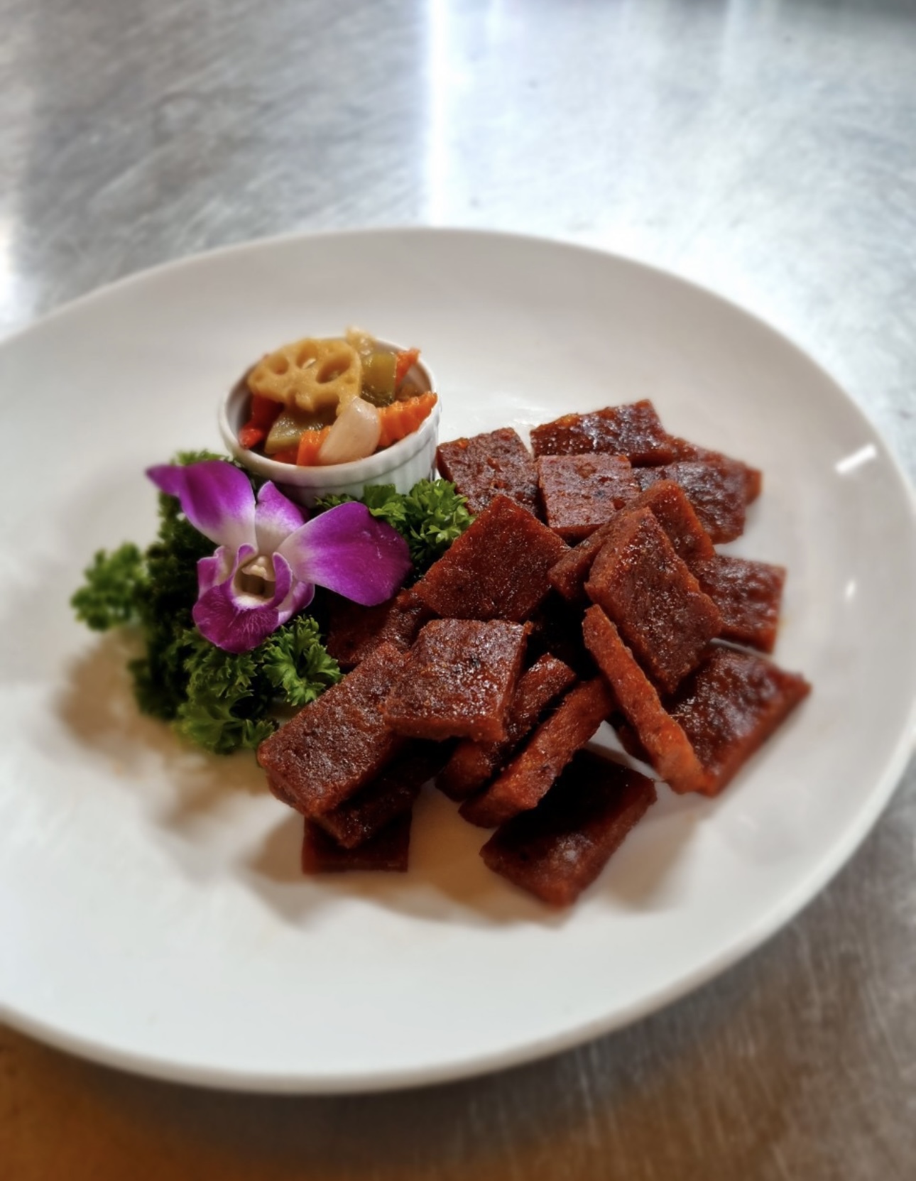 Đây là 1 loại thịt Heo sấy khô nguồn gốc từ tỉnh Phúc Kiến- Trung Hoa. Món ăn Bakkwa (Nhục Căn) nầy được du nhập vào Malaysia và Singapore và hiện đang là 1 món ăn nổi tiếng của Singapore.