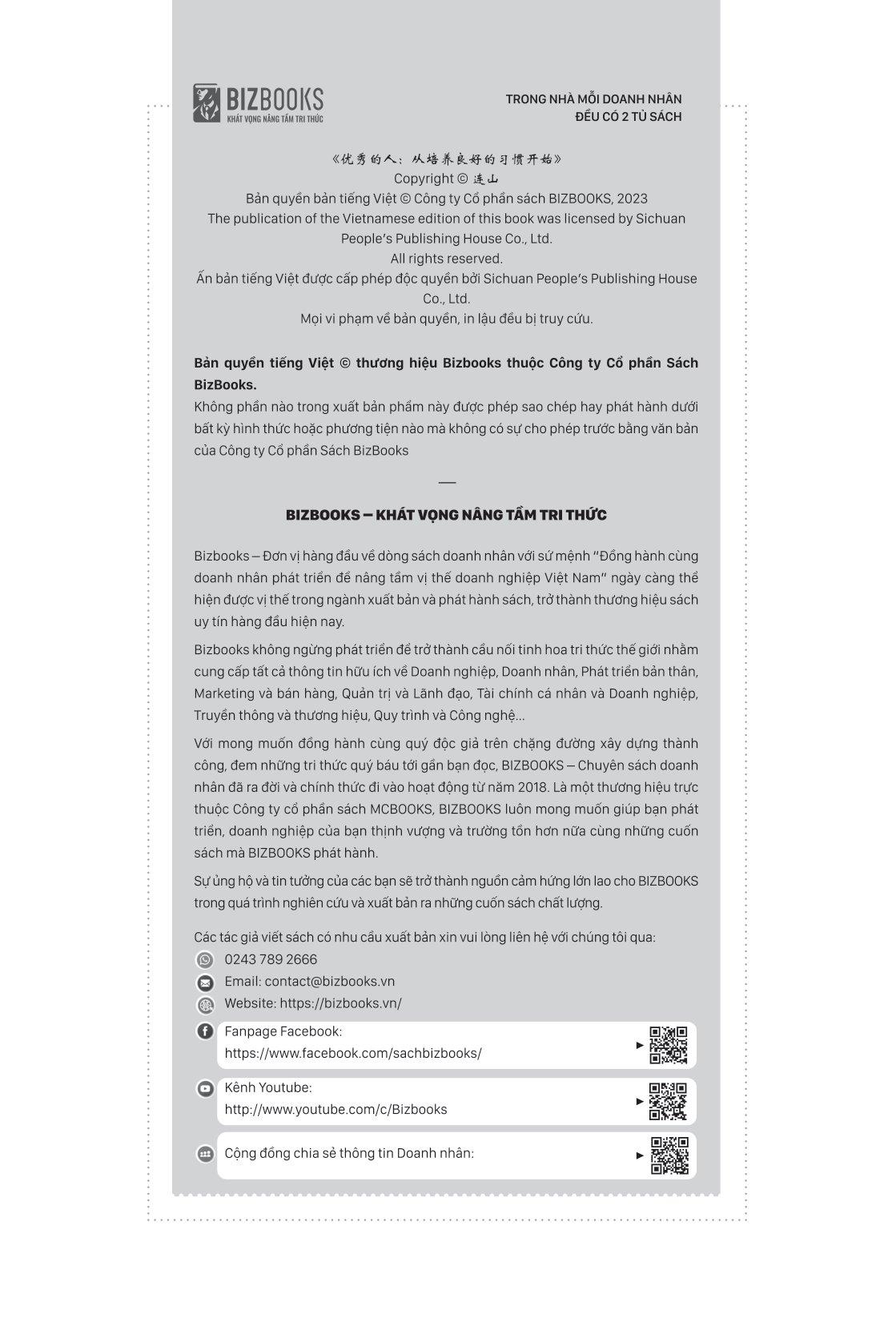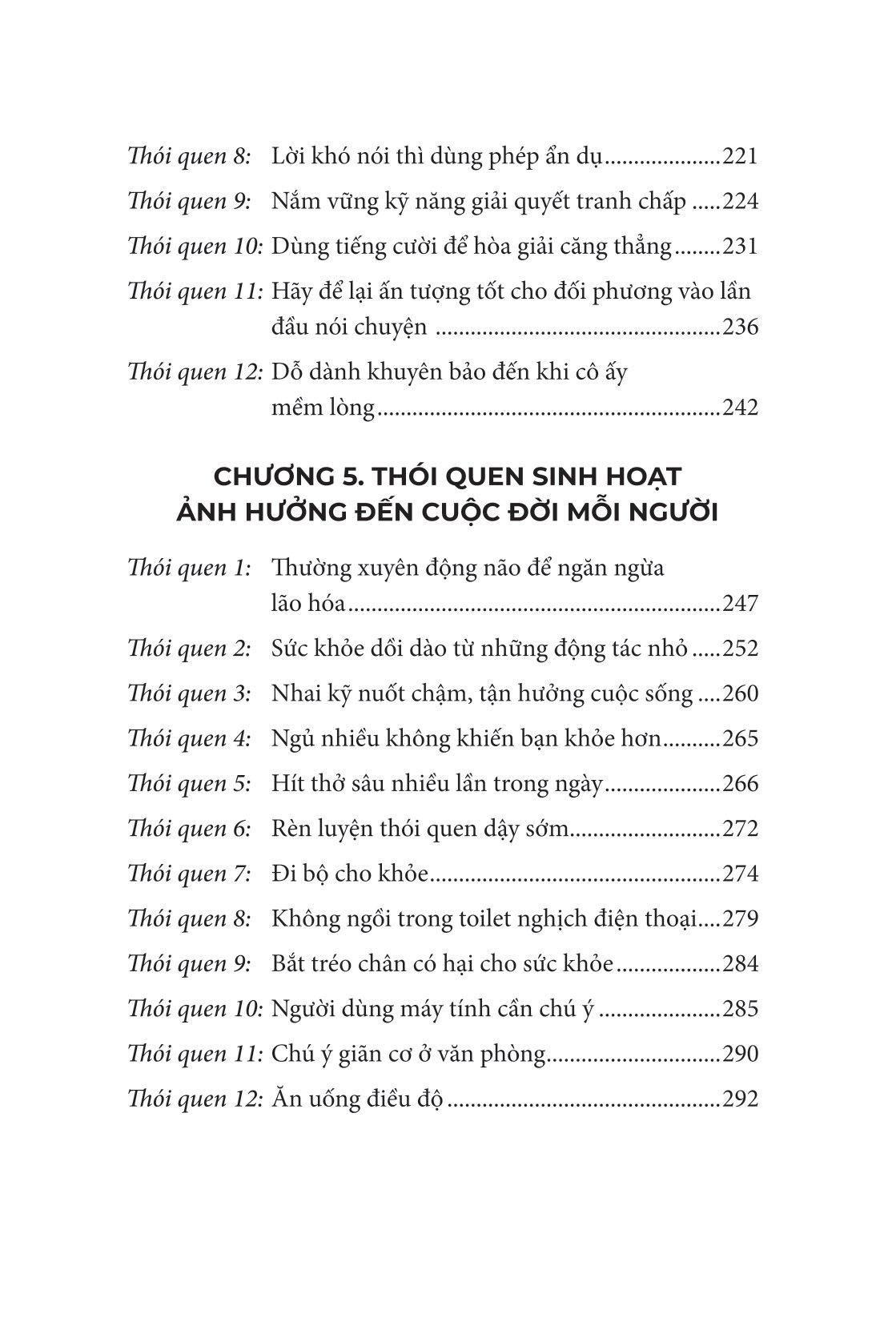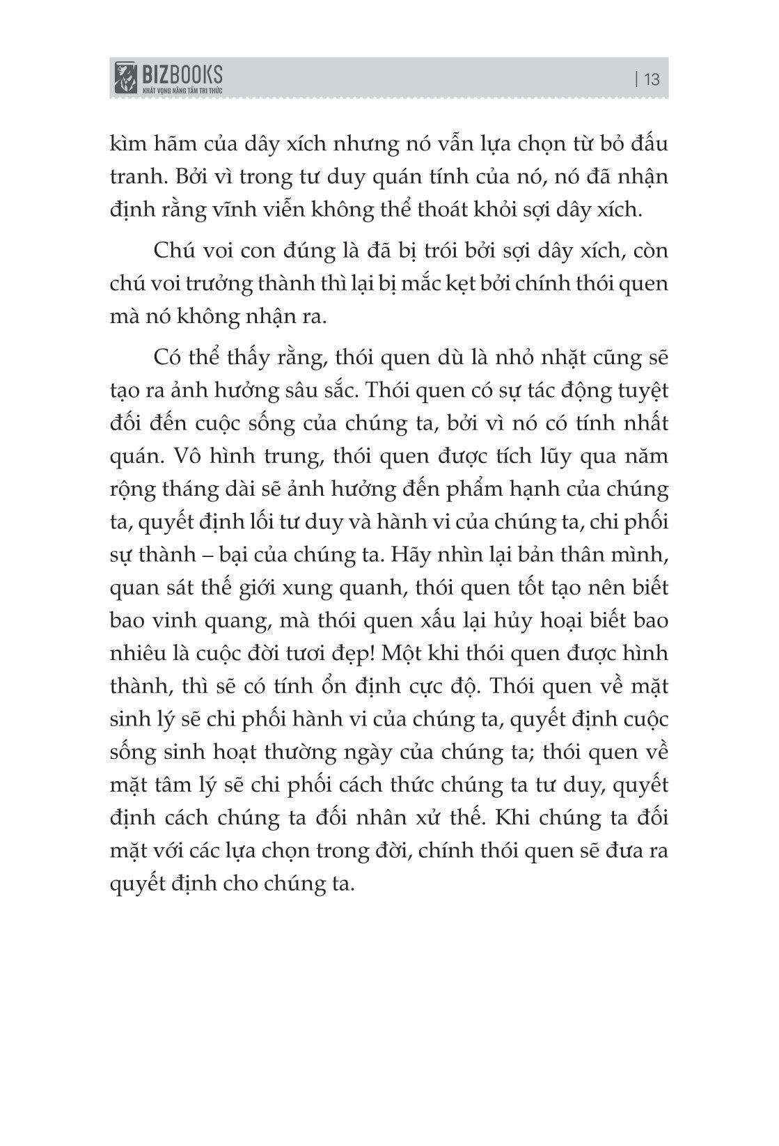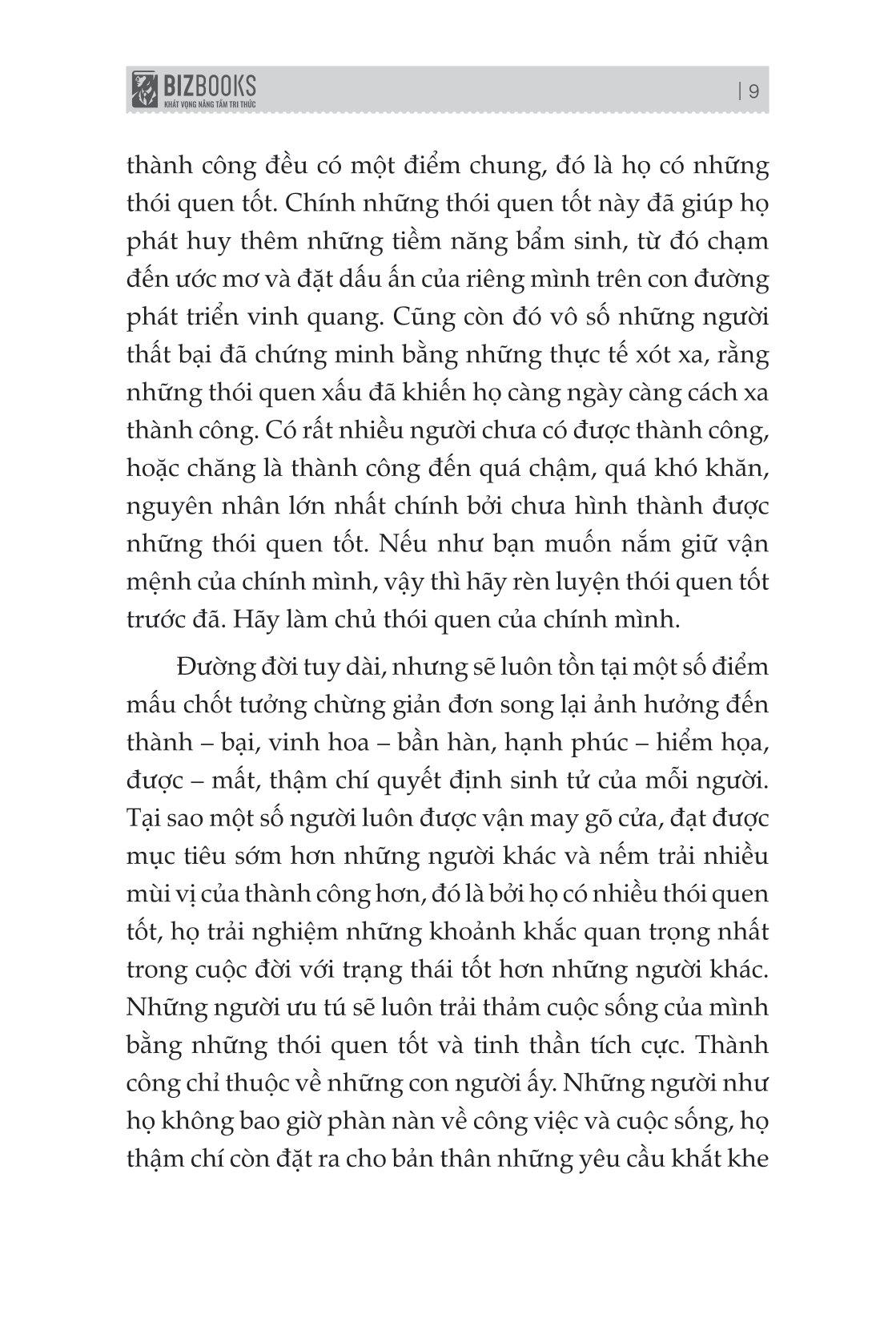 Cuốn sách sẽ đưa bạn khám phá cách phát triển và duy trì những thói quen tích cực có thể dẫn đến một cuộc sống trọn vẹn và ý nghĩa hơn. Bạn sẽ học được cách giữ vững niềm tin, cải thiện các mối quan hệ, thay đổi cách nghĩ và hành động của m.ình. Bạn sẽ tìm thấy trong cuốn sách những phương pháp cụ thể và chi tiết để thay đổi các thói quen tiêu cực thành thói quen tích cực. Từ việc tăng cường hiệu suất làm việc, xây dựng mối quan hệ tốt đẹp đến tận hưởng cuộc sống cân bằng hơn, cuốn sách sẽ giúp bạn thực hiện những thay đổi nhỏ nhưng quan trọng để dẫn dắt bạn đến những thành công lớn