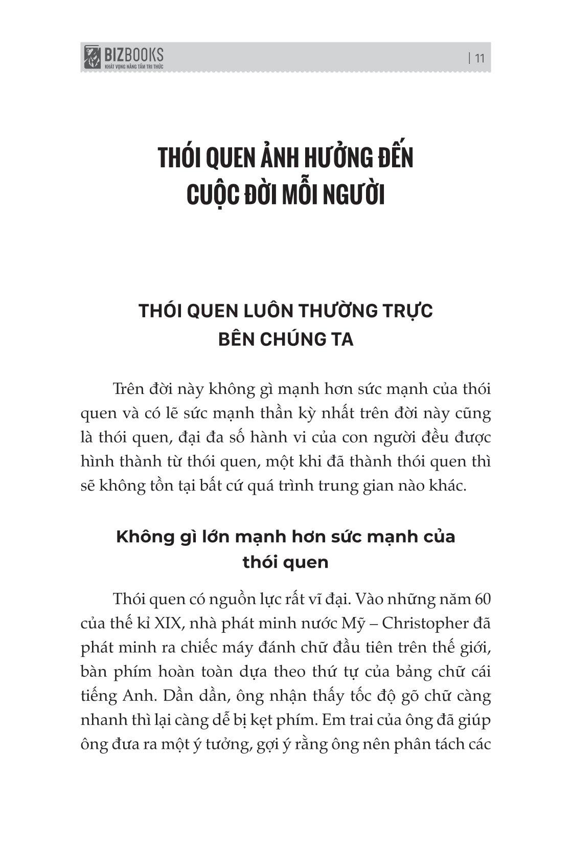Trong cuốn sách nhà thơ La Mã cổ đại đã nói: “Không gì mạnh hơn sức mạnh của thói quen”. Bậc thầy thành công người Mỹ Napoleon Hill cũng nói: “Thói quen quyết định thành bại”. Thói quen chính là đàu tàu tư tưởng và hành vi mỗi người. Thói quen tốt giúp giảm thiểu thời gian tư duy nâng cao hiệu suất làm việc, thói quen xấu giúp chúng ta khép kín bảo thủ luôn cho m.ình là đúng và khư khư giữ lấy lề lối cũ. Bên cạnh đó, cuốn sách nhấn mạnh tầm quan trọng của các vòng lặp thói quen, bao gồm một gợi ý, một thói quen và một phần thưởng. Nó giải thích làm thế nào hiểu được những vòng lặp này có thể giúp phá vỡ những thói quen xấu và thay thế chúng bằng những thói quen lành mạnh hơn. Nó cũng đi sâu vào khái niệm thói quen then chốt, là những thói quen nhỏ có thể tạo ra hiệu ứng lan tỏa và tác động tích cực đến các lĩnh vực khác của cuộc sống