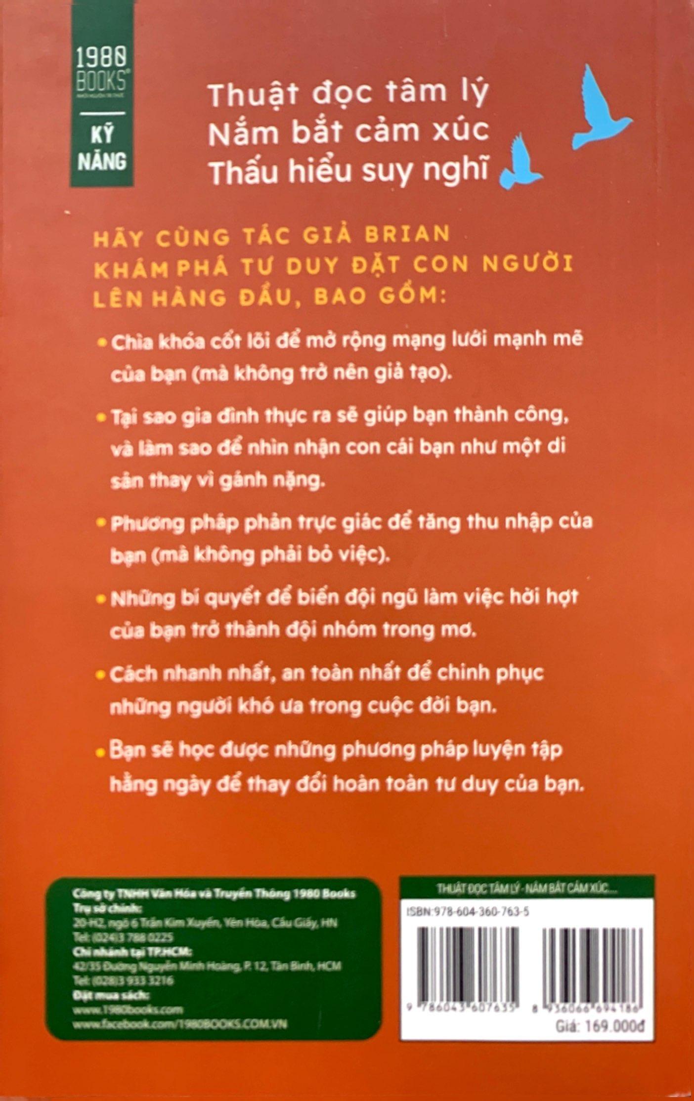 Sau khi thất bại trong nhiều mối quan hệ và dự án, Brian Dixon quyết tâm khám phá bí quyết để hạnh phúc trong công việc mà sống một cuộc đời có ý nghĩa. Trong Khéo léo đối nhân, được lòng thiên hạ, Brian trao cho bạn chiếc chìa khoá quan trọng nhất để hạnh phúc trong các mối quan hệ của bạn và mở cánh cửa đến mục tiêu, đam mê, và lợi nhuận. Sự thật là, bạn không tự mình đạt được ước mơ. Bạn cần những người xung quanh. Và họ cũng cần bạn. “Thuật đọc tâm lý, nắm bắt cảm xúc, thấu hiểu suy nghĩ’’ là cuốn sách hướng dẫn đầy đủ để giúp bạn tận dụng nguồn tài nguyên quan trọng nhất để thành công trong kinh doanh và cuộc sống. =>> Hãy cùng tác giả Brian khám phá tư duy đặt con người lên hàng đầu, bao gồm: