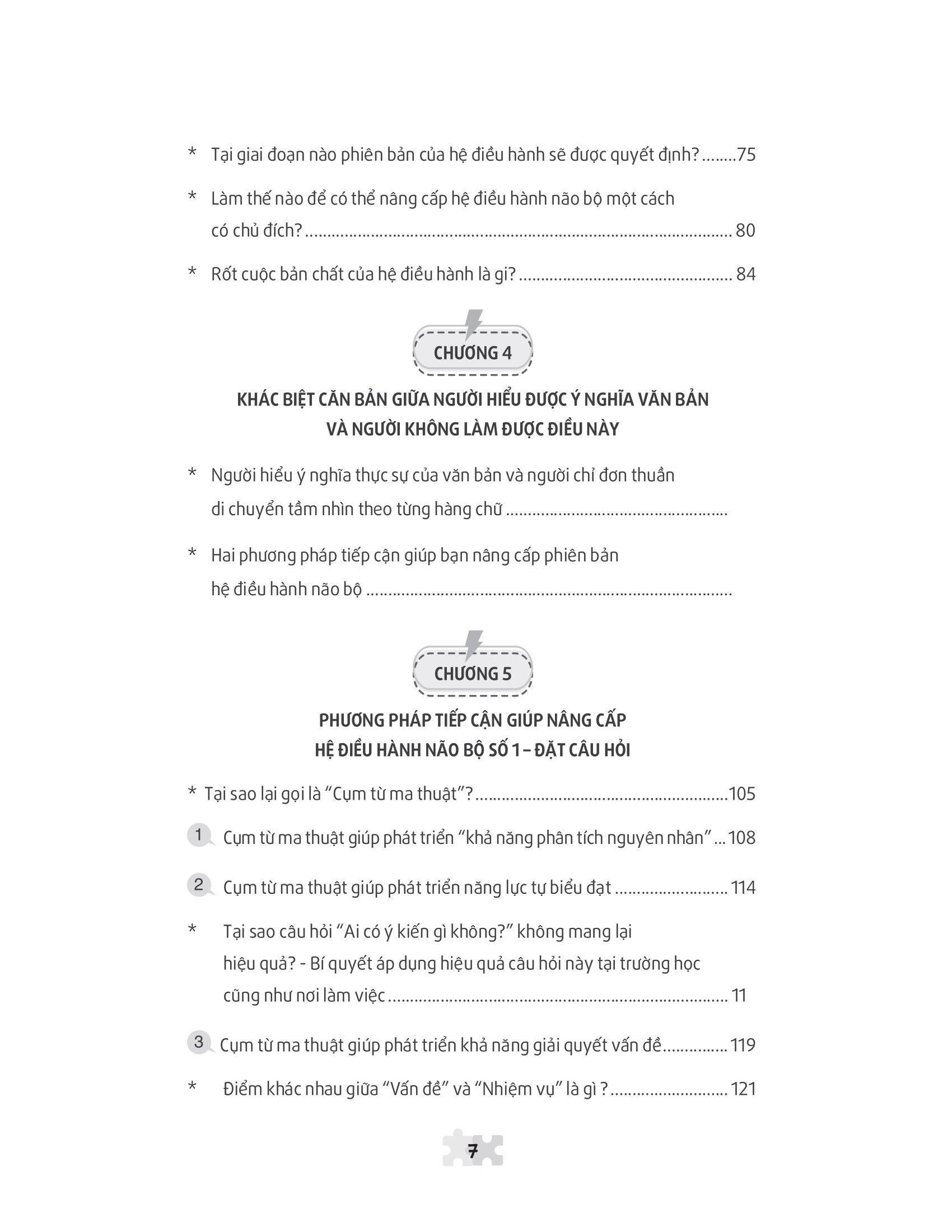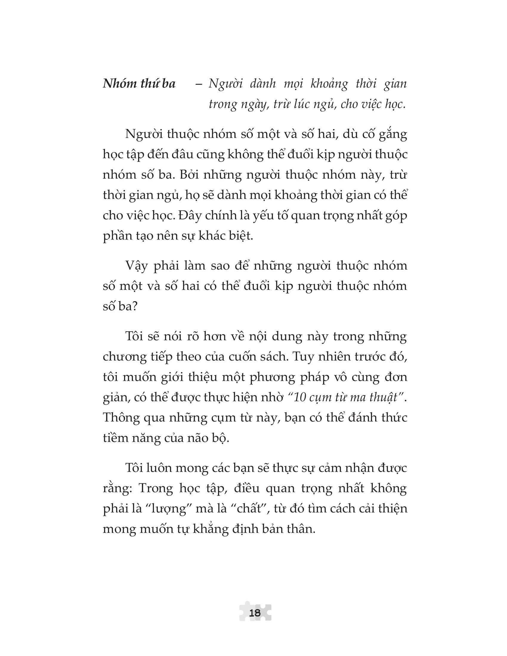 - Làm thế nào để học tập, làm việc đạt được kết quả cao hơn? Nó có thể do bẩm sinh nhưng cũng có thể do sự khác biệt về phương pháp học tập hay làm việc. Một khi tìm được nguyên nhân, bạn sẽ nhận ra phương hướng cho sự nỗ lực của m.ình. Vì vậy, khi kết quả đạt được không như ý, đó không phải là do bạn nỗ lực chưa đủ, mà là do phương hướng bạn lựa chọn đã sai lầm ngay từ đầu. Điều quan trọng chính là tìm ra cách cải thiện não bộ của chính bạn, phương pháp đó được gọi là thuật “hack não”. Một khi “thông số kỹ thuật” của hệ điều hành não bộ được cải thiện, hành động so sánh này sẽ dần được giảm thiểu, đồng thời, mong muốn tự khẳng định bản thân cũng nâng cao. Khi mong muốn tự khẳng định bản thân được nâng cao, bạn sẽ hoà nhã, thân thiện hơn với những người xung quanh bởi khi đó bạn hài lòng với chính m.ình. Con người có xu hướng tìm kiếm những điểm tương đồng với tâm hồn, vì thế khi bạn hài lòng với chính m.ình, bạn sẽ nhìn thấy những điểm tốt, những điều tuyệt vời ở đối phương. Ngược lại, khi bạn bất mãn với chính bản thân m.ình, bạn sẽ chỉ nhìn thấy những khiếm khuyết, những thiếu sót của họ. Do đó, nâng cao mong muốn tự khẳng định bản thân cũng là một yếu tố quan trọng giúp bạn cảm thấy hài lòng, thoả mãn hơn với chính m.ình. Vậy, hãy tìm kiếm phương pháp giúp đánh thức tiềm năng não bộ, tăng cường khả năng tư duy, tìm ra sức hấp dẫn của riêng bạn, tìm kiếm những phần tốt đẹp hơn so với bạn trong quá khứ và phát triển chúng. Tác giả: Katsunori Ishida là Giám đốc đại diện Phòng Nghiên cứu thiết kế chương trình giáo dục tại Nhật Bản. Ông đã tổ chức rất nhiều chương trình như Mama Café, các buổi diễn thuyết, viết sách… với mong muốn “giảm thiểu tình trạng trẻ em chán ghét việc học”.