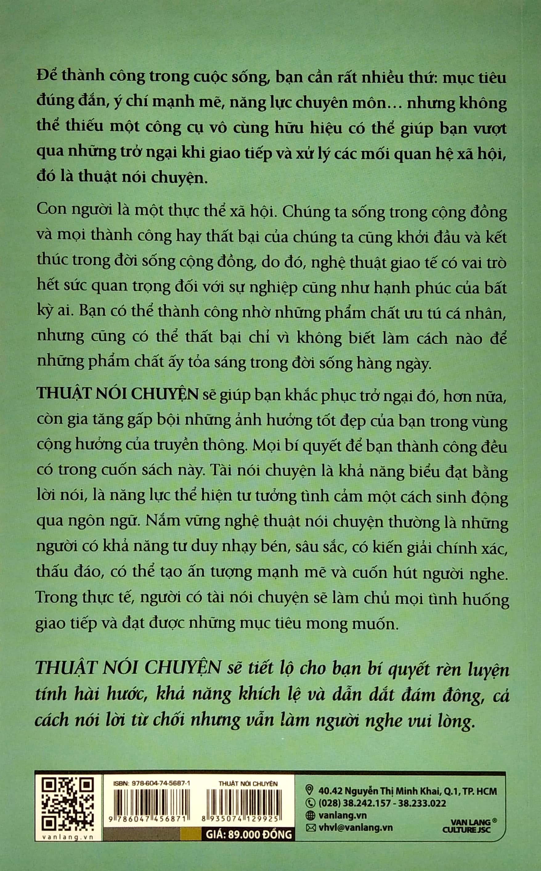 Để thành công trong cuộc sống, bạn cần rất nhiều thứ: mục tiêu đúng đắn, ý chí mạnh mẽ, năng lực chuyên môn… nhưng không thể thiếu một công cụ vô cùng hữu hiệu có thể giúp bạn vượt qua những trở ngại khi giao tiếp và xử lý các mối quan hệ xã hội, đó là thuật nói chuyện. Con người là một thực thể xã hội. Chúng ta sống trong cộng đồng và mọi thành công hay thất bại của chúng ta cũng khởi đầu và kết thúc trong đời sống cộng đồng, do đó, nghệ thuật giao tế có vai trò hết sức quan trọng đối với sự nghiệp cũng như hạnh phúc của bất kỳ ai. Bạn có thể thành công nhờ những phẩm chất ưu tú cá nhân, nhưng cũng có thể thất bại chỉ vì không biết làm cách nào để những phẩm chất ấy tỏa sáng trong đời sống hàng ngày. THUẬT NÓI CHUYỆN sẽ giúp bạn khắc phục trở ngại đó, hơn nữa, còn gia tăng gấp bội những ảnh hưởng tốt đẹp của bạn trong vùng cộng hưởng của truyền thông. Mọi bí quyết để bạn thành công đều có trong cuốn sách này. Tài nói chuyện là khả năng biểu đạt bằng lời nói, là năng lực thể hiện tư tưởng tình cảm một cách sinh động qua ngôn ngữ. Nắm vững nghệ thuật nói chuyện thường là những người có khả năng tư duy nhạy bén, sâu sắc, có kiến giải chính xác, thấu đáo, có thể tạo ấn tượng mạnh mẽ và cuốn hút người nghe. Trong thực tế, người có tài nói chuyện sẽ làm chủ mọi tình huống giao tiếp và đạt được những mục tiêu mong muốn. THUẬT NÓI CHUYỆN sẽ tiết lộ cho bạn bí quyết rèn luyện tính hài hước, khả năng khích lệ và dẫn dắt đám đông, cả cách nói lời từ chối nhưng vẫn làm người nghe vui lòng.