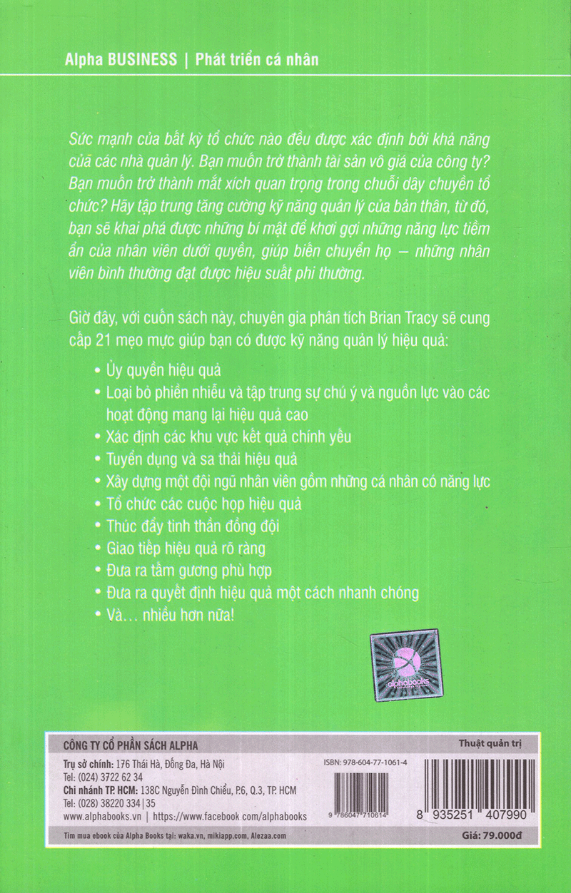 Sức mạnh của bất kỳ tổ chức nào đều được xác định bởi khả năng của các nhà quản lý. Bạn muốn trở thành mắt xích quan trọng trong chuỗi dây chuyền tổ chức? Hãy tập trung tăng cường kỹ năng quản lý của bản thân, từ đó, bạn sẽ khai phá được những bí mật để khơi gợi những năng lực tiềm ẩn của nhân viên giưới quyền, giúp biến chuyển họ - những nhân viên bình thường đạt được hiệu suất phi thường. Giờ đây, với cuốn sách Thuật Quản Trị, chuyên gia phân tích Brian Tracy sẽ cung cấp 21 mẹo giúp bạn có được kỹ năng quản lý hiệu quả: