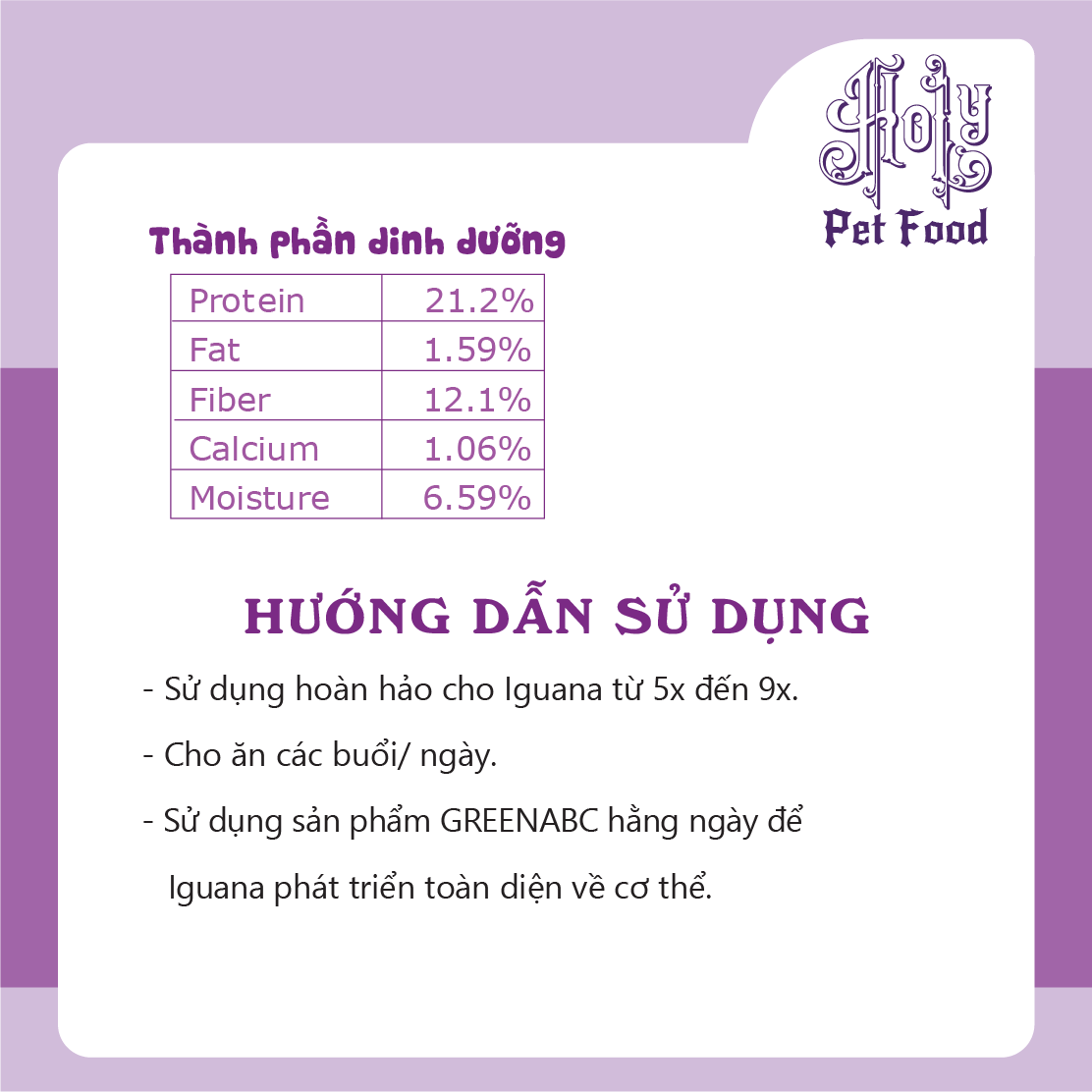 GREENABC - THỨC ĂN IGUANA Baby Dạng VIÊN - Rồng Nam Mỹ Baby từ 5x đến 9x GREENABC là thức ăn cao cấp dành cho Iguana Trưởng Thành - Rồng Nam Mỹ Trưởng Thành. Đặc biệt sản phẩm GREENABC được sản xuất theo phương pháp Áp dụng công nghệ PROTEIN bền vững từ bột đạm G.Meal rất giàu PROTEIN – CANXI – LIPID có trong BSFL, đã được Mỹ (AAFCO) và EU chấp nhận đưa vào công thức cho ngành sản xuất thức ăn dành cho vật nuôi. Sản phẩm GREENABC cung cấp các giá trị dinh dưỡng bền vững cho Iguana với sự kết hợp 80% thành phần có nguồn gốc thực vật và 20% thành phần có nguồn gốc động vật từ côn trùng, giúp cho Iguana: