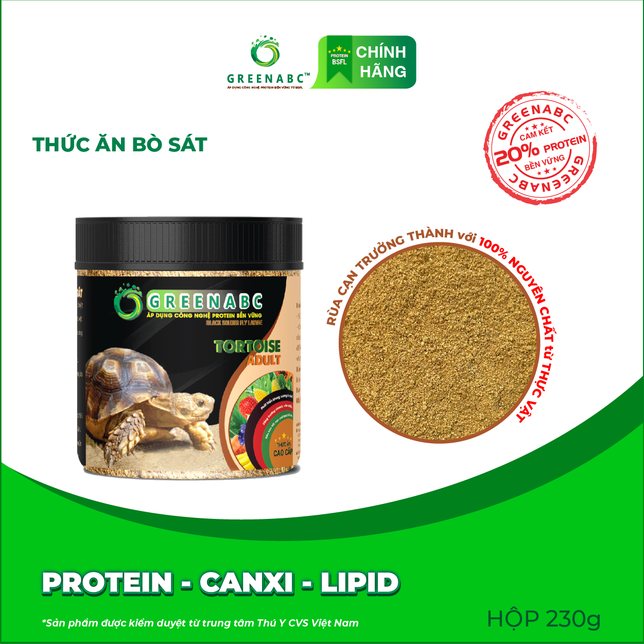 GREENABC - THỨC ĂN RÙA CẠN 100% TỪ THỰC VẬT - HÀM LƯỢNG PROTEIN 20% GREENABC là thức ăn cao cấp dành cho các loại RÙA CẠN. Đặc biệt sản phẩm GREENABC được sản xuất từ cỏ và các loại thực vật để cung cấp cho Rùa Cạn (Tortoise) một chế độ ăn ít protein nhưng giàu chất xơ và canxi, giúp: