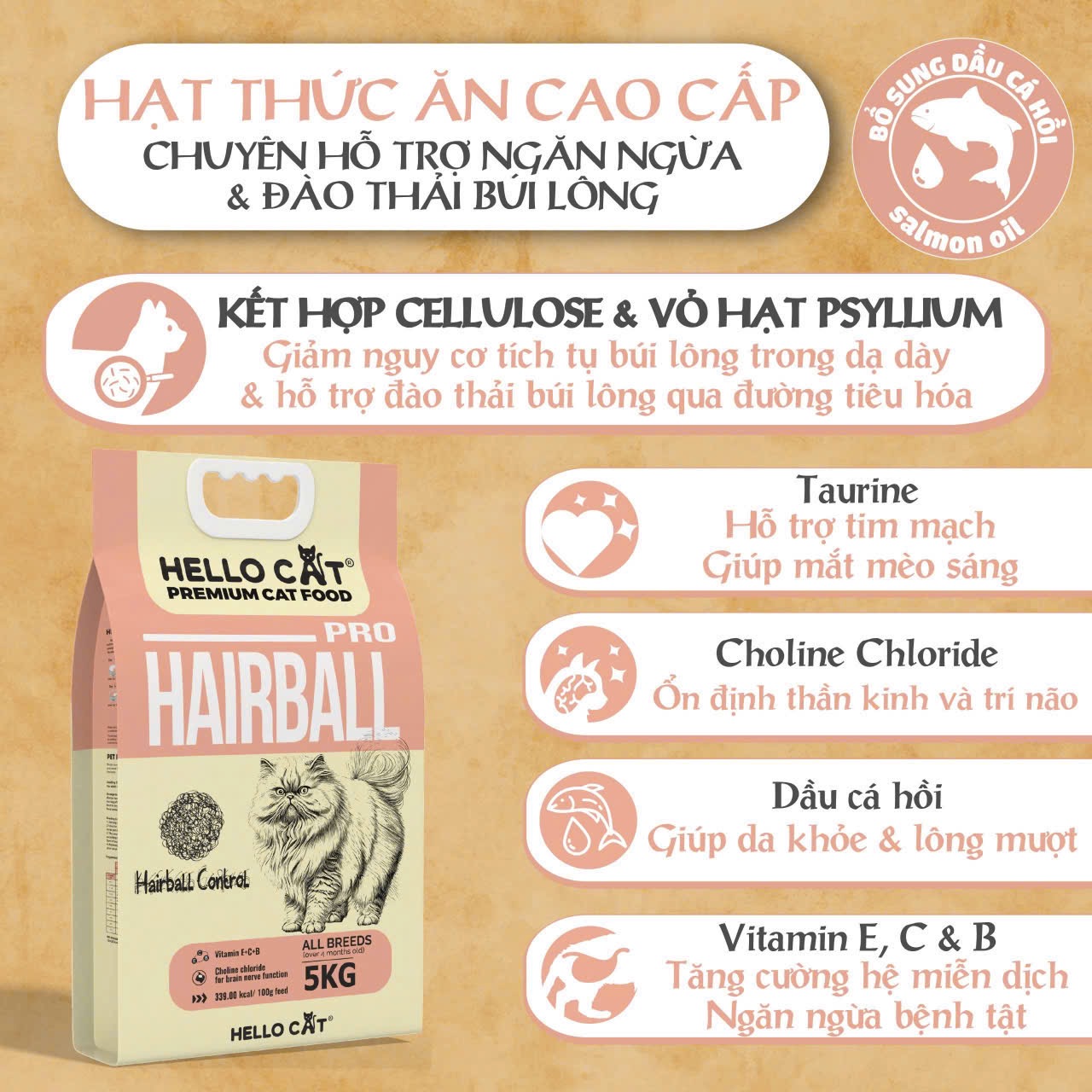 THỨC ĂN CHO MÈO HELLO CAT HAIRBALL 5KG Quy cách đóng gói: Bao xá 5kg Dành cho mèo trên 4 tháng tuổi Thành phần dinh dưỡng: