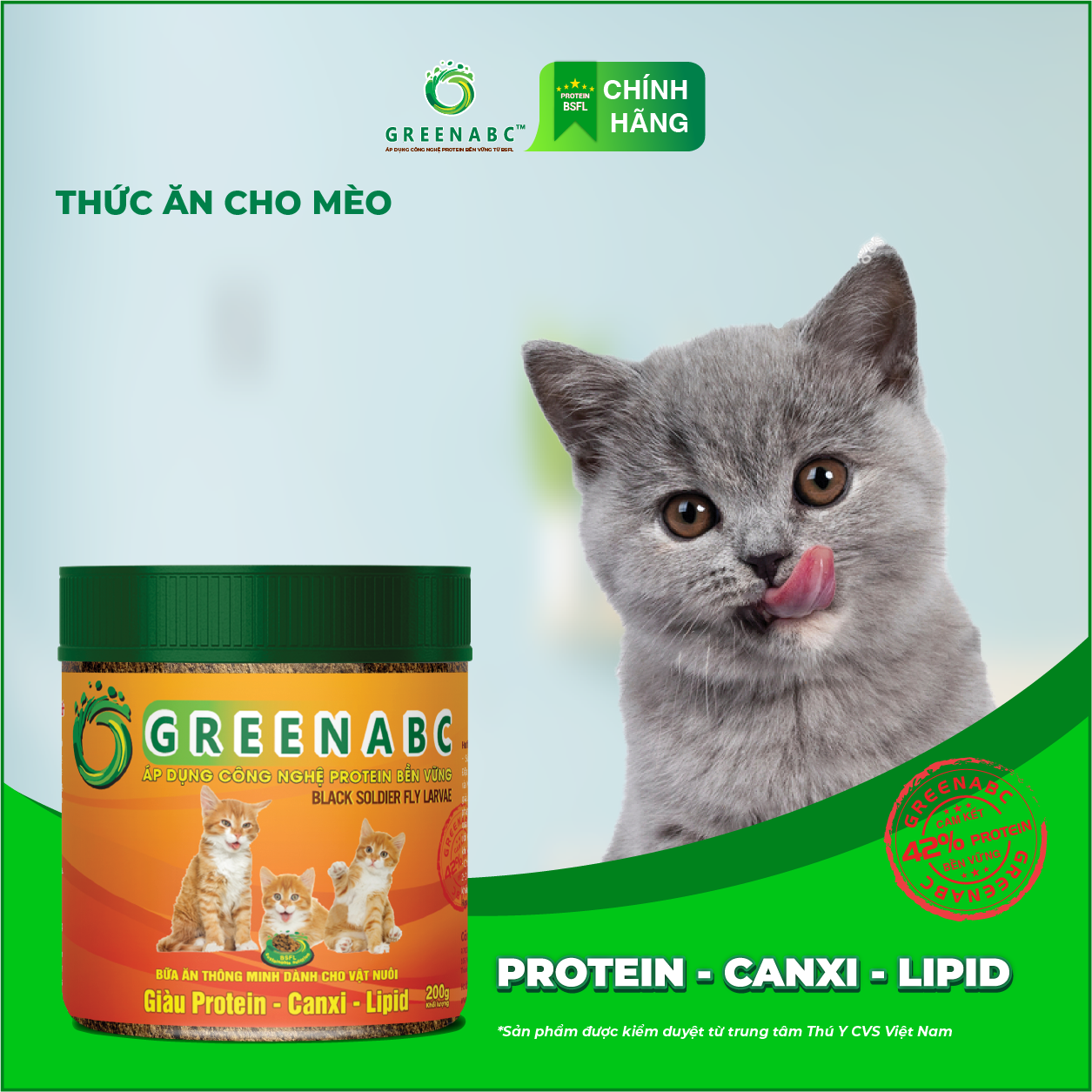 GREENABC là thức ăn cao cấp dành cho các mèo. Đặc biệt sản phẩm GREENABC được sản xuất theo phương pháp Áp dụng công nghệ PROTEIN BỀN VỮNG từ bột đạm G.Meal rất giàu PROTEIN–CANXI–LIPID có trong BSFL*, đã được Mỹ (AAFCO) và EU chấp nhận đưa vào công thức cho ngành sản xuất thức ăn dành cho thú cưng.