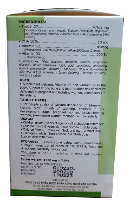- Vitamin D3 (Cholecalciferol): 200 IU Phụ liệu: chất độn (Lactose, mannitol, sorbitol, glucose khan), chất điều vị (acid citric, sucralose), chất chống đông vón (magnesi stearat), chất kết dính (Polyvinylpyrrolidone K30 (PVP K30)), hương dâu, phẩm màu (màu Ponceau 4R) vừa đủ 1 viên. Công dụng Bổ sung Calci, Vitamin D3 và Vitamin K2 cho cơ thể. Hỗ trợ xương răng chắc khỏe, giảm nguy cơ và cải thiện tình trạng chậm lớn ở trẻ em, thiếu calci ở phụ nữ có thai và cho con bú, loãng xương ở người cao tuổi Đối tượng sử dụng Dùng cho người có nguy cơ thiếu calci: trẻ em còi xương, chậm lớn, chậm mọc răng, trẻ đang giai đoạn phát triển, phụ nữ có thai, phụ nữ cho con bú, phụ nữ tiền mãn kinh, người cao tuổi Cách dùng -Trẻ dưới 2 tuổi tham khảo ý kiến thầy thuốc trước khi dùng -Trẻ dưới 2- 5 tuổi: Ngậm hoặc nhai 1 viên/ngày -Trẻ từ 6 -9 tuổi: Ngậm hoặc nhai 1-2 viên/ngày -Thiếu niên, người lớn: Ngậm hoặc nhai 2-4 viên/ngày Ngậm hoặc nhai cùng bữa ăn, nên dùng liên tục ít nhất 8 tuần để đạt kết quả tốt. Bảo quản
