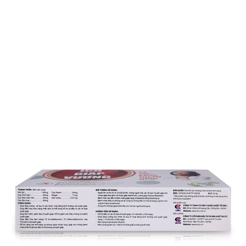 - Phụ liệu: Lactose, magnesi stearate, polyvinyl alcohol, titanium dioxide vừa đủ. Công dụng Hỗ trợ giảm sự tiến triển của bướu cổ lành tính, giảm nguy cơ bướu cổ do thiếu iod, hỗ trợ giảm nhẹ các triệu chứng của bướu tuyến giáp. Đối tượng sử dụng