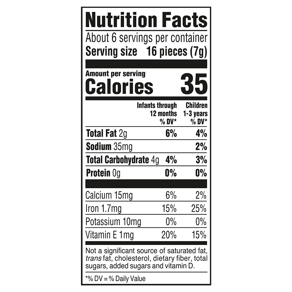 - Bánh ăn dặm Gerber Crunchies với kết cấu giòn tan, kích thích vị giác bé khám phá thế giới ẩm thực. Hương vị tự nhiên, không chứa chất tạo ngọt và hương liệu an toàn cho sức khỏe của bé. Thành phần