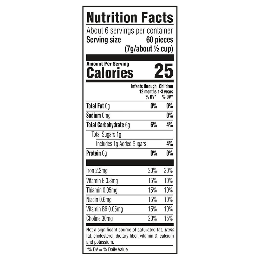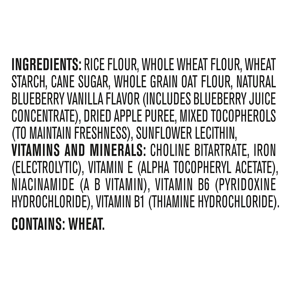 - Bột gạo, bột lúa mì nguyên cảm, tinh bột lúa mì, đường mía, bột yến mạch nguyên cám, hương liệu việt quất vani tự nhiên, bột tảo, chất chống oxy hóa tocopherol concentrat (dạng hỗn hợp), chất nhũ hóa lecithin hướng dương, choline bitartrate, sắt nguyên tổ (điện phân), d-alpha-tocopheryl acetat (vitamin E), nicotinamid, pyridoxin hydroclorid (vitamin B6), thiamin hydroclorid (vitamin B1). Ưu điểm vượt trội của bánh Gerber Puff