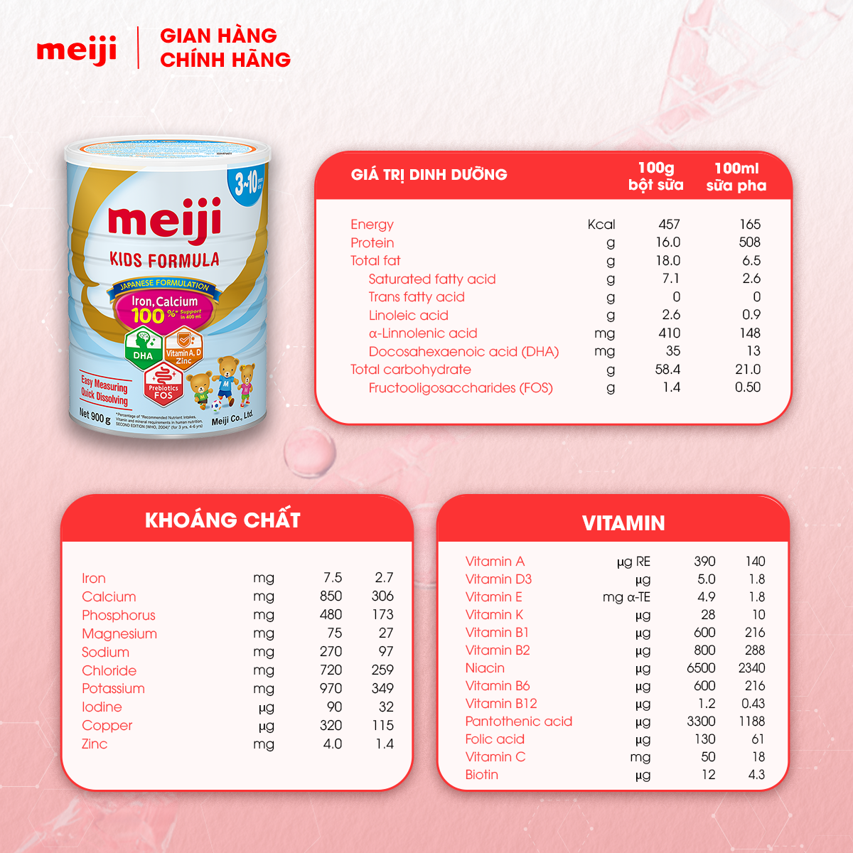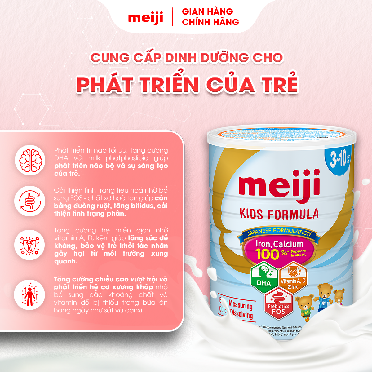 - Meiji Kids Formula chứa các chất dinh dưỡng cần thiết cho sự phát triển khỏe mạnh của trẻ từ 3 tuổi trở lên,có vị thanh nhạt dễ uống, hạn chế lượng đường.