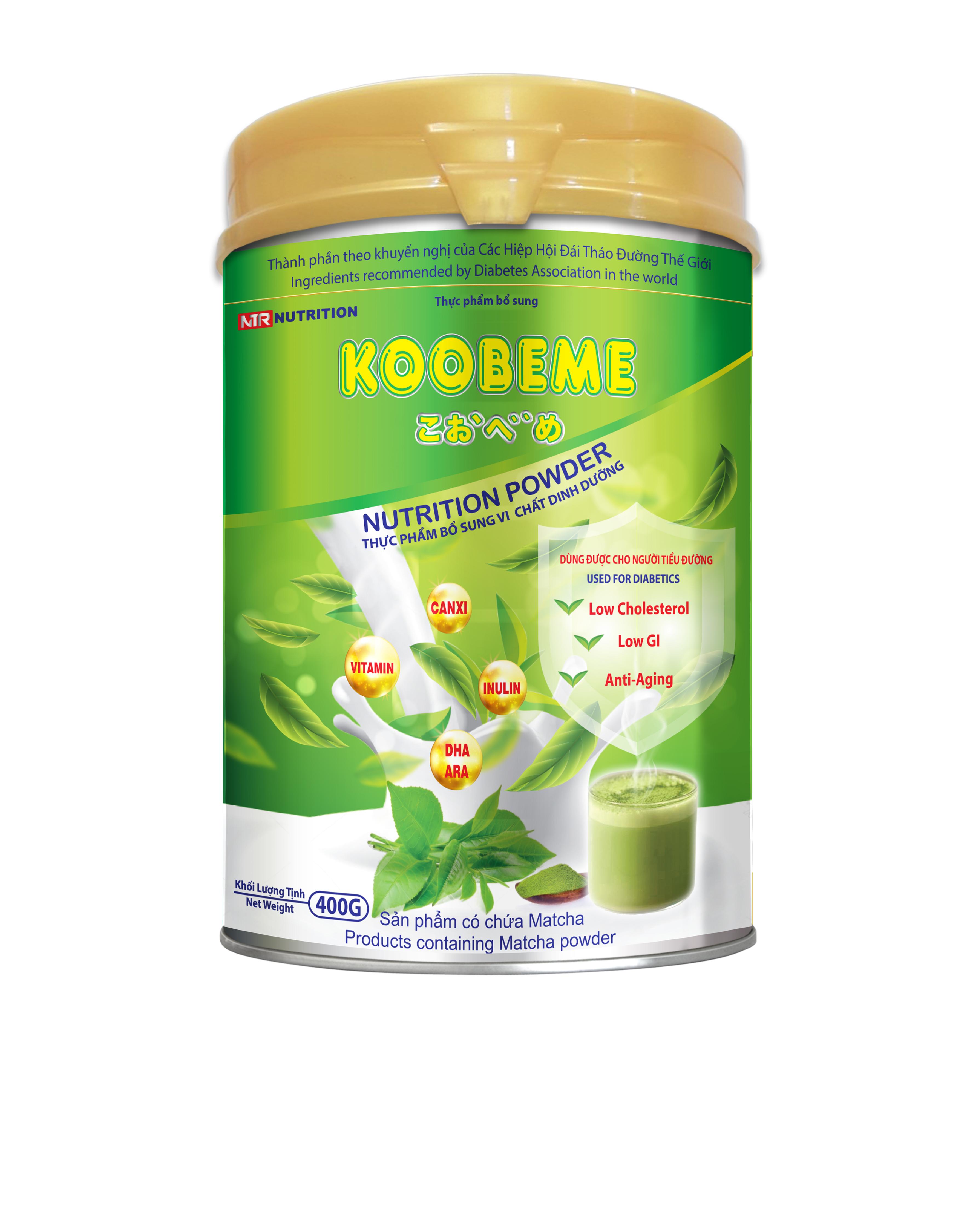THỰC PHẨM BỔ SUNG VI CHẤT DINH DƯỠNG NUTRITION POWDER Thành phần có chứa MATCHA dùng cho người muốn giảm cân hoặc tiểu đường KOOBEME   Thành phần: Sữa bột tách béo (Skim milk powder), Bột trà Matcha (Greentea Matcha), Isomalt, Non Dairy Creamer, Vitamin A, Vitamin B1, Vitamin B6, Vitamin D3, Vitamin E, Vitamin K1, Vitamin C, Acid - Pantothenic, Biotin, Canxi, Phốtpho, Natri, DHA, ARA, Inulin.   MATCHA có chứa chất chống oxy hóa Polyphenol và EGCG. Giúp giảm căng thẳng mệt mỏi, giảm cholesterol, và điều chỉnh lượng đường trong máu từ đó giúp ngăn ngừa hoặc kiểm soát bệnh tiểu đường rất hiệu quả. INULIN là các prebiotic nuôi dưỡng hệ vi sinh có lợi phát triển, thúc đẩy hấp thu khoáng chất và tăng sức đề kháng. Sự kết hợp của các vitamin A, C, E, vitamin nhóm B, Axit Folic và các khoáng chất Magie, Kẽm giúp tăng cường sức đề kháng, tái tạo tế bào, giảm tình trạng mệt mỏi. Đường hấp thu chậm Isomalt có chỉ số đường huyết thấp (kiểm nghiệm lâm sàn GI<50) không làm đường huyết tăng nhanh sau khi ăn.   MATCHA contains antioxidants Polyphenols and EGCG. Helps reduce stress, reduce cholesterol, and regulate blood sugar levels, thus helping to prevent or control diabetes very effectively. INULIN is prebiotics that nourish beneficial microflora, promote absorption of minerals and increase resistance The combination of vitamins A, C, E, vitamins group B, Axit Folic and the minerals Magnesium, Zinc, enhances the resistance, regenerate new cells, reducing fatigue. ISOMALT sugar slowly absorbed with a low glycemic index (GI clinical testing <50) that does not make rapid increase in blood sugar after eating. Đối tượng sử dụng/ User: Sản phẩm thích hợp cho người tiểu đường, người tiền tiểu đường, người bị cao huyết áp và người có nhu cầu ăn kiêng đường. The product is suitable for diabetics, prediabetes, people with high blood pressure and people wishing to eat less sugar.   Đối tượng sử dụng/ User: Sản phẩm thích hợp cho người tiểu đường, người tiền tiểu đường, người bị cao huyết áp và người có nhu cầu ăn kiêng đường. The product is suitable for diabetics, prediabetes, people with high blood pressure and people wishing to eat less sugar.   Lượng dùng đề nghị/ Recommended dosage Mỗi ngày nên uống từ 2 – 3 ly, và không quá 1200ml trong một ngày. Có thể được dùng như thức ăn bổ sung hoặc thay thế bữa ăn. Sản phẩm này có thể dùng trong thời gian dài. Every day should drink 2-3 cups and no more than 1200ml in a day . Can be used as food supplements or meal replacement. This product can be used for a long time.   Lưu ý quan trọng/ Important notice: