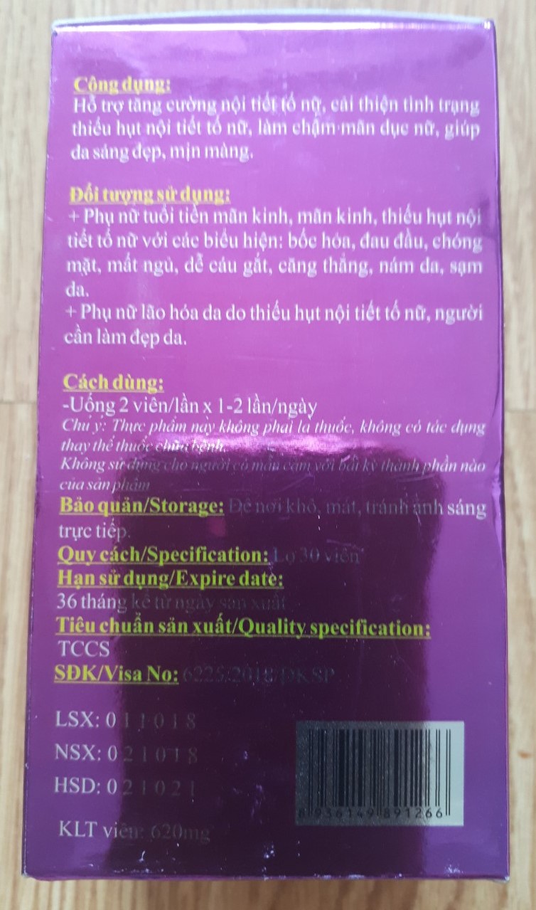 Quy Cách Đóng Gói: Hộp 30 viên Công dụng : Hỗ trợ tăng cường nội tiết tố nữ, giảm các biểu hiện thiếu hụt nội tiết tố estrogen ở phụ nữ tiền mãn kinh, mãn kinh, suy giảm chức năng sinh lý nữ. Hỗ trợ giảm nám, tàn nhang, hỗ trợ da sáng đẹp, mịn màng. Đối tượng sử dụng: